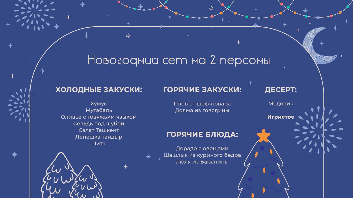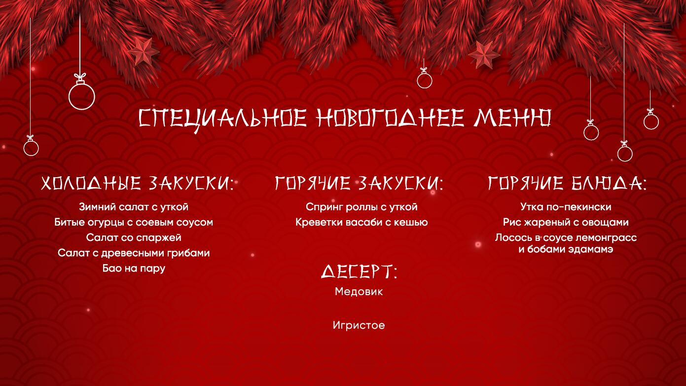 Мы составили изысканное меню, состоящее из холодных и горячих закусок, салатов, горячих блюд и десерта
