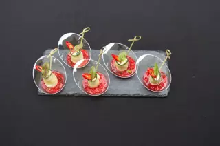 Веррин с тартаром из лосося и перепелиным желтком (28 гр.)Филе лосося, желток перепела200 руб.
