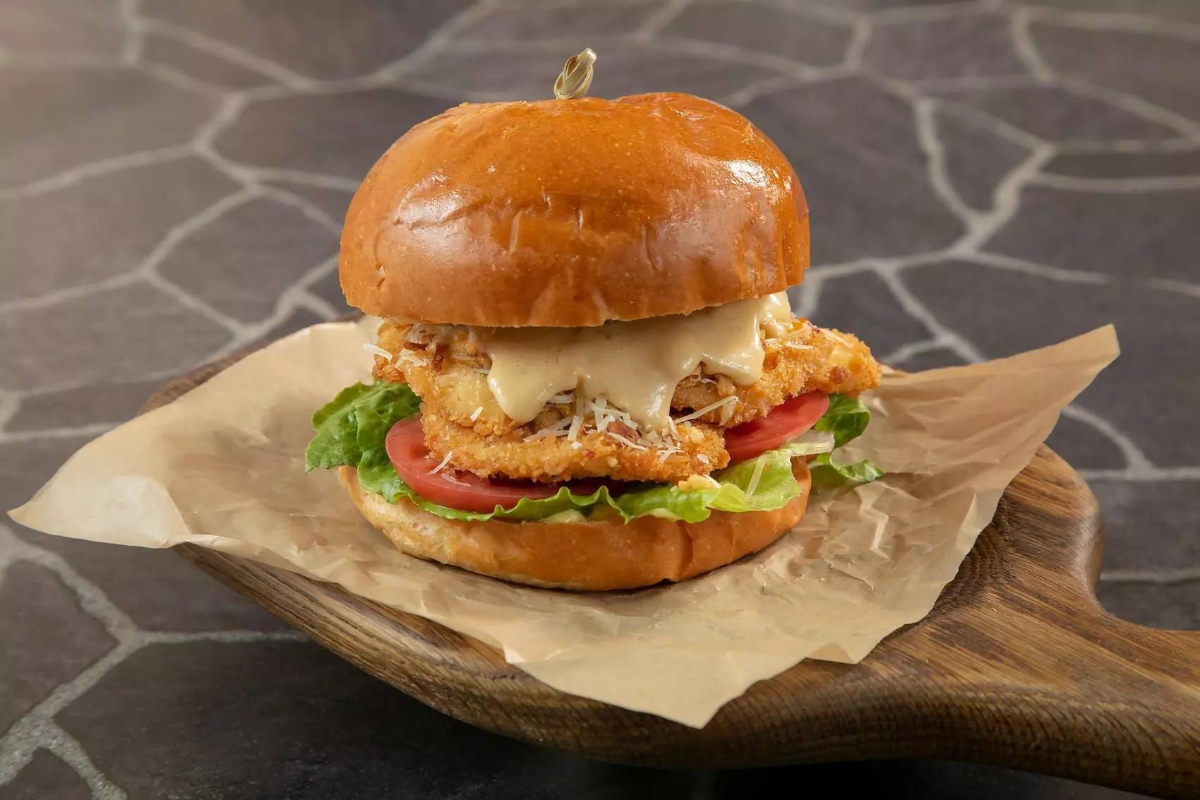 Ичибан (320 гр)Бургер с куриными наггетсами, листьями салата, свежими томатами, сырами чеддер и пармезаном, сырным соусом, соусом Цезарь.650 руб.
