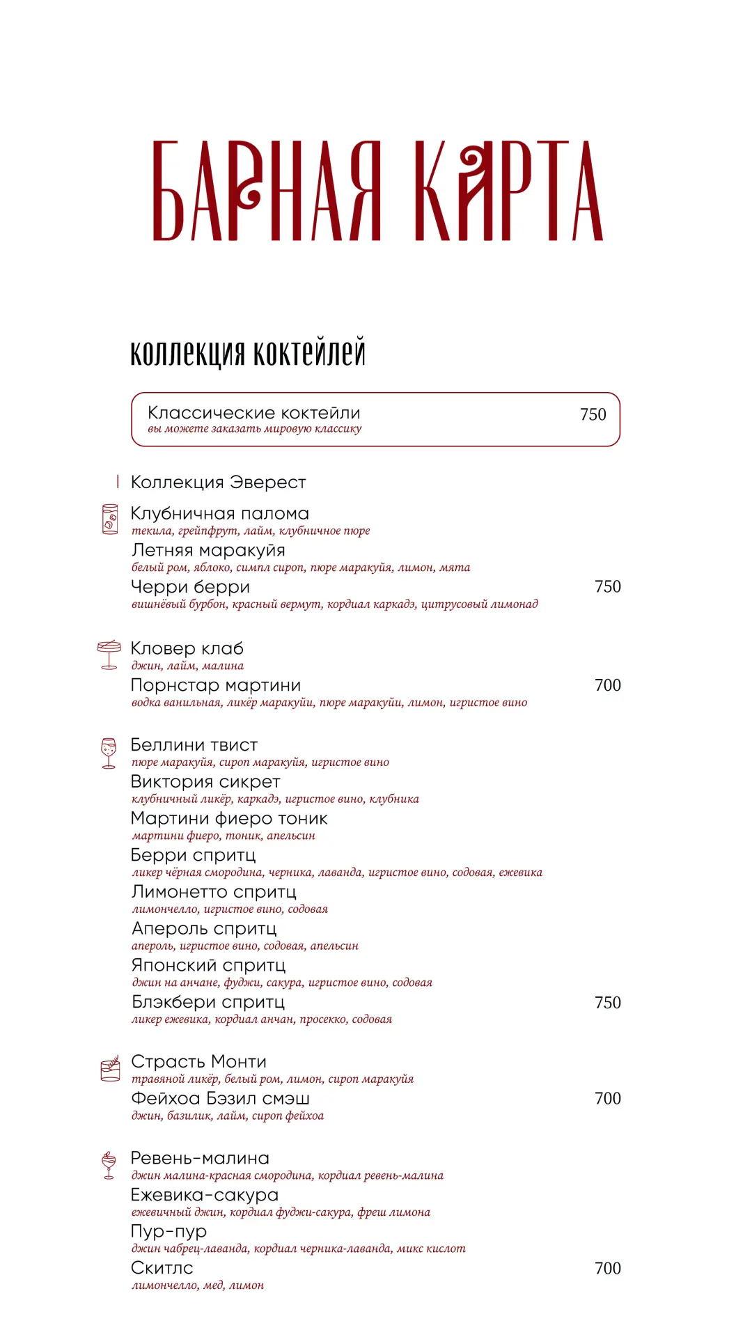Основное направление заведения — это организация пространства для спокойного времяпрепровождения с акцентом на кальянную культуру. Everest Garden предлагает разнообразие вкусов и смесей, которые готовятся опытными мастерами с использованием качественных ингредиентов. Помимо этого, в меню представлен выбор напитков и лёгких закусок, которые дополняют общую концепцию заведения. Также предлагается ресторанная еда из-под ножа от партнера "Сыроварня".