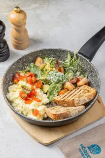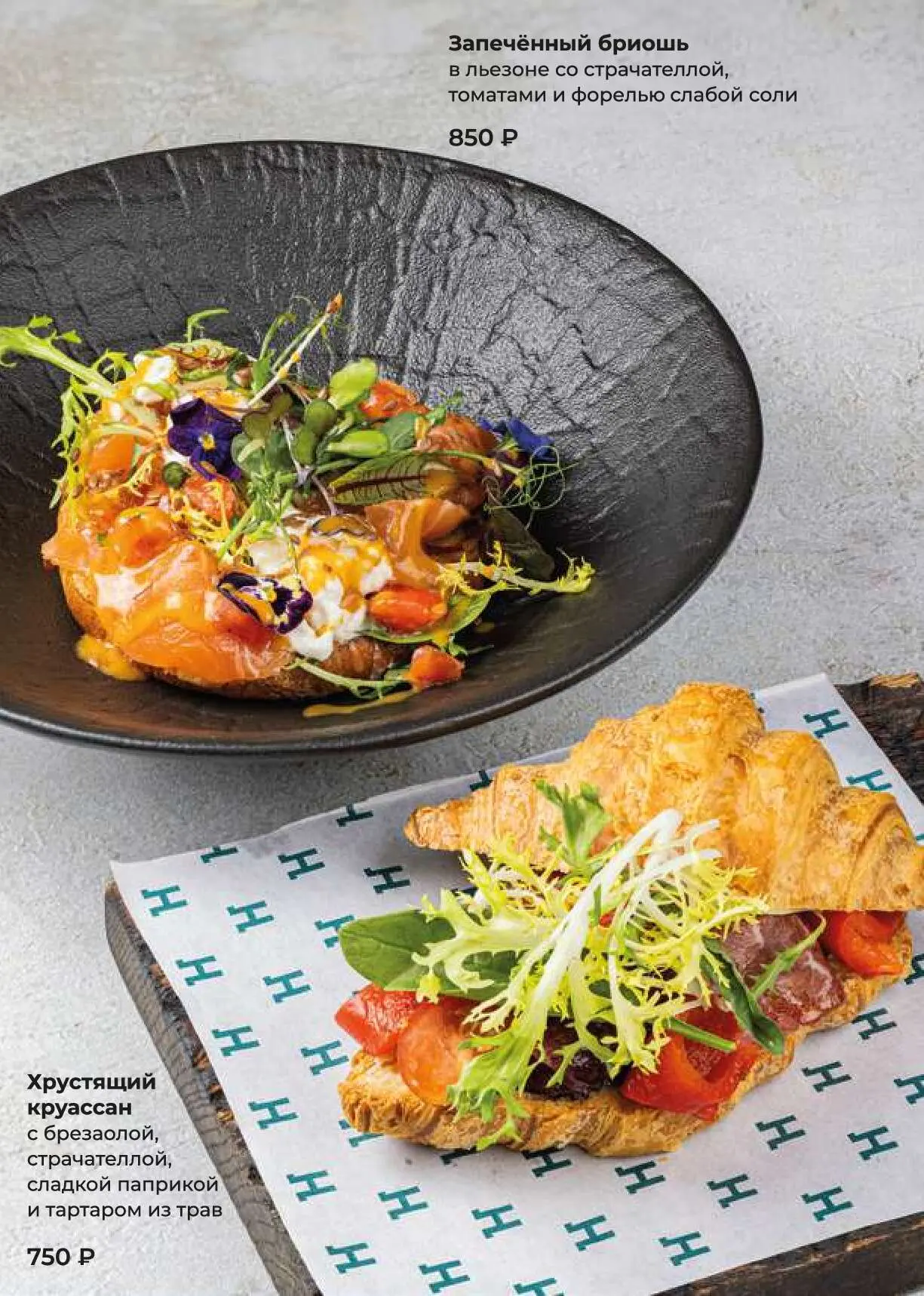 Запеченный бриошьв льезоне со страчателлой, томатами и форелью слабой соли850 руб.