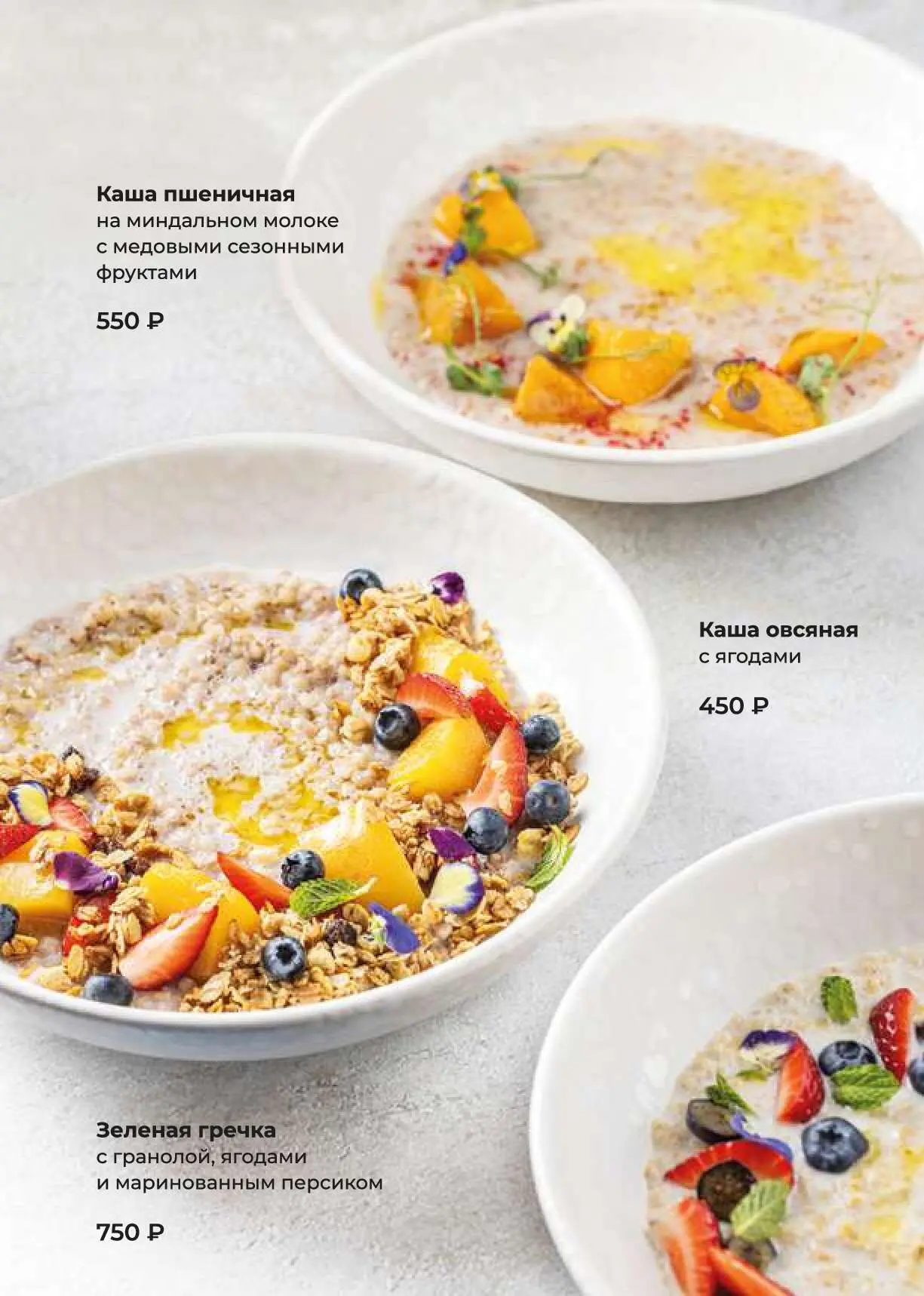 Каша пшеничнаяна миндальном молоке с медовыми сезонными фруктами550 руб.