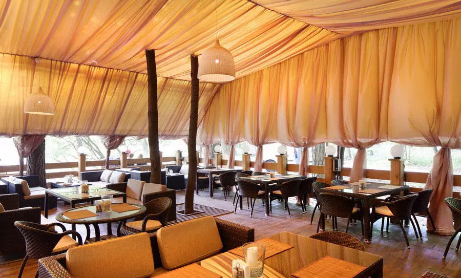 Заведение представляет собой дом, выполненный в современном стиле, удачно расположенный на берегу старинного пруда. Интерьер выполнен в стиле «прованс», в нем в изобилии присутствуют оттенки натурального дерева и множество легких, белоснежных тканей. Необыкновенно высокие потолки, большие окна, обрамленные легкими струящимися занавесками, утонченная, изящная мебель, все это создает расслабляющую атмосферу отдыха. Если посмотреть в окно, то можно насладиться прекрасным видом пруда, который находится в окружении старых вязов. В летнее время между соснами располагается открытая веранда, которая делает отдых на природе еще более проникновенным.