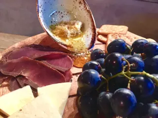 Доска к вину для компаниибастурма, сулугуни домашний, сулугуни копченый, сыр Гуда, виноград, фундук, оливки гигант, соты, мед, крекер1200 руб.