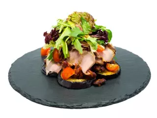 Салат с языком (210 гр)Телячий деликатес приготовленный в сувиде при низкой температуре 8 часов, креольский картофель, помидоры черри, красный лук и соленые огурцы. Заправляется медево-горчичным соусом350 руб.