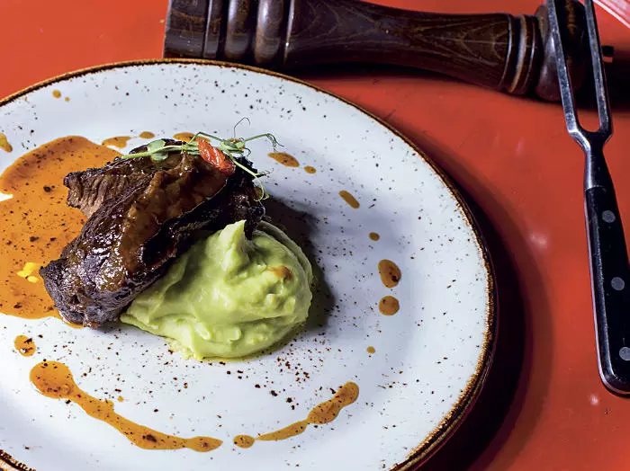 Телячьи Щечки с пюре вассаби (150/120 гр)Телячьи щечки готовятся сутки при низкой температуре с овощами, портвейном, смесь пяти перцев, розмарин, чеснок, за счет способа приготовления щечки тают во рту. Подаются с пикантным пюре с добавлением вассаби, украшается свежим Базиликом710 руб.