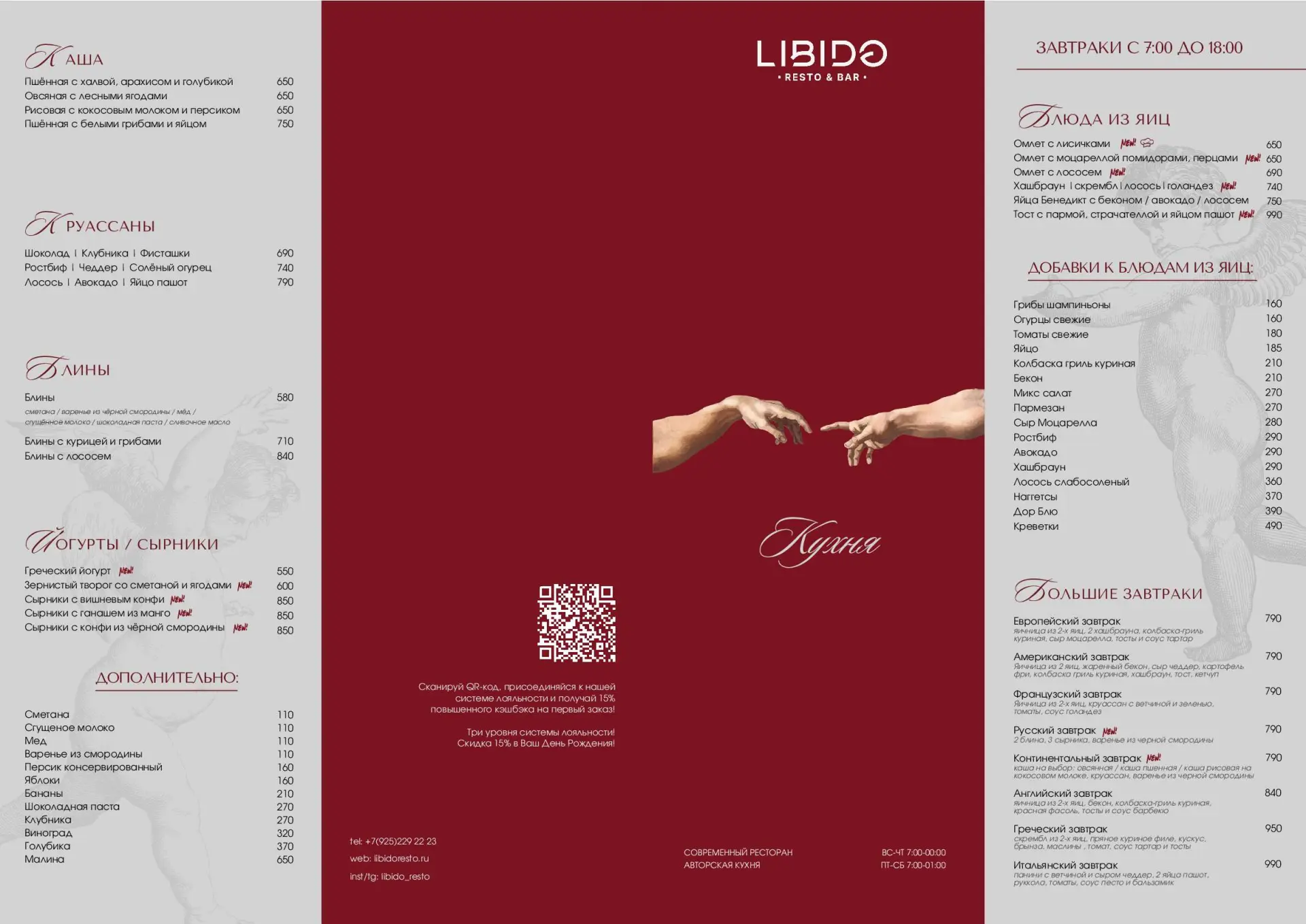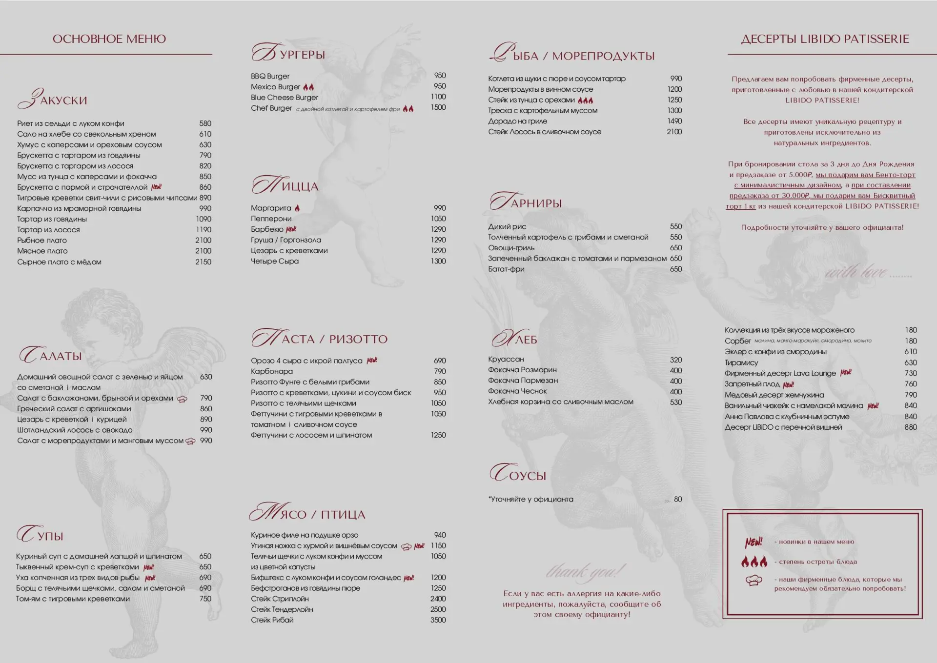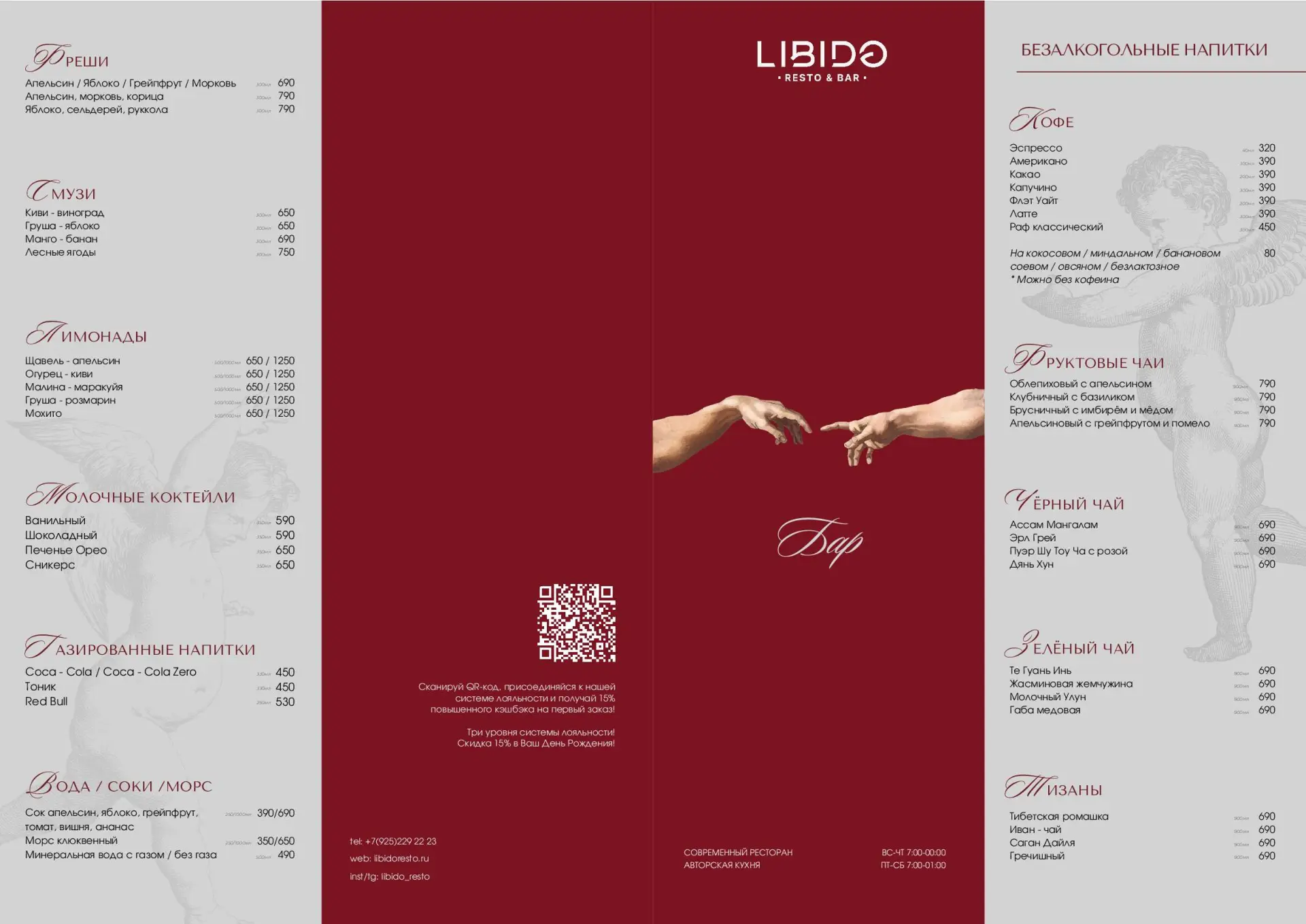 Главная идея ресторана Libido – выразить индивидуальность и креативный подход к кулинарии. Заведение гармонично сочетает вкусную еду и чувственный стиль. Здесь стремятся не только сытно накормить, но и показать ценность уникальных вкусов. Если желаете побаловать себя чем-то особенным, приходите сюда. Изысканные блюда европейской кухни, приготовленные по индивидуальным рецептам, удовлетворят даже самые экстравагантные вкусы.