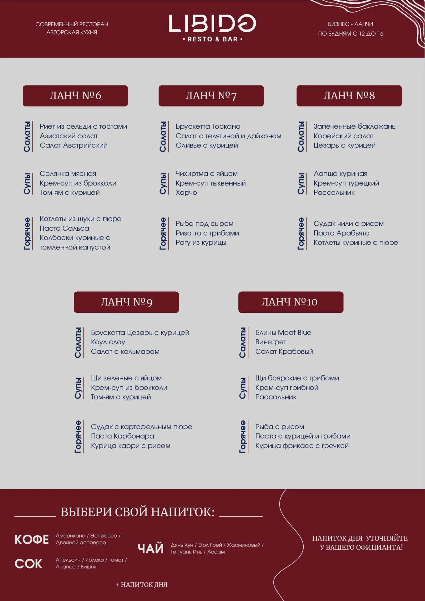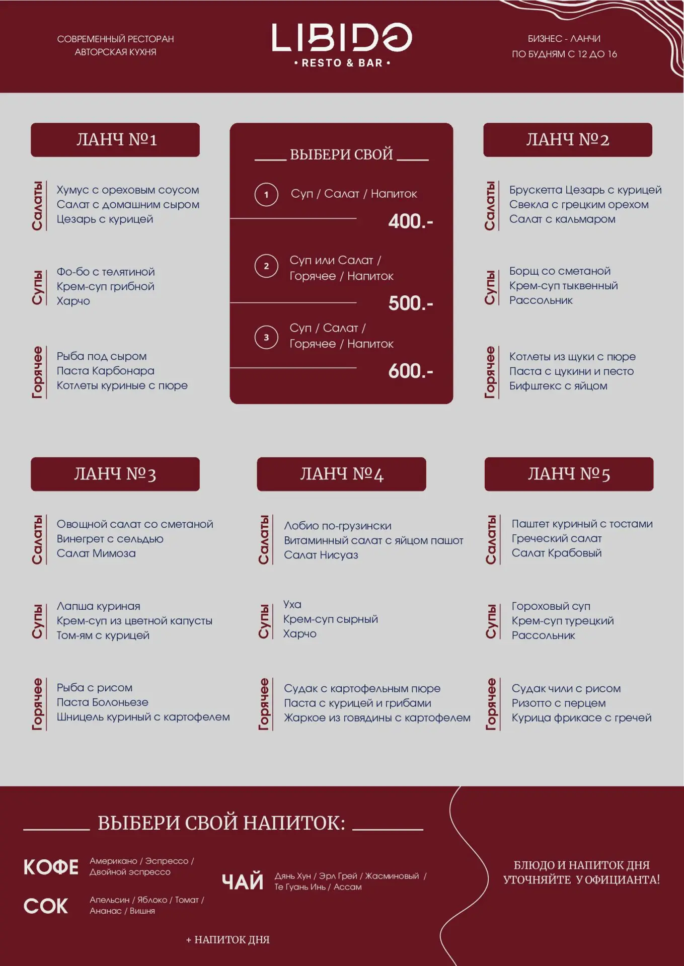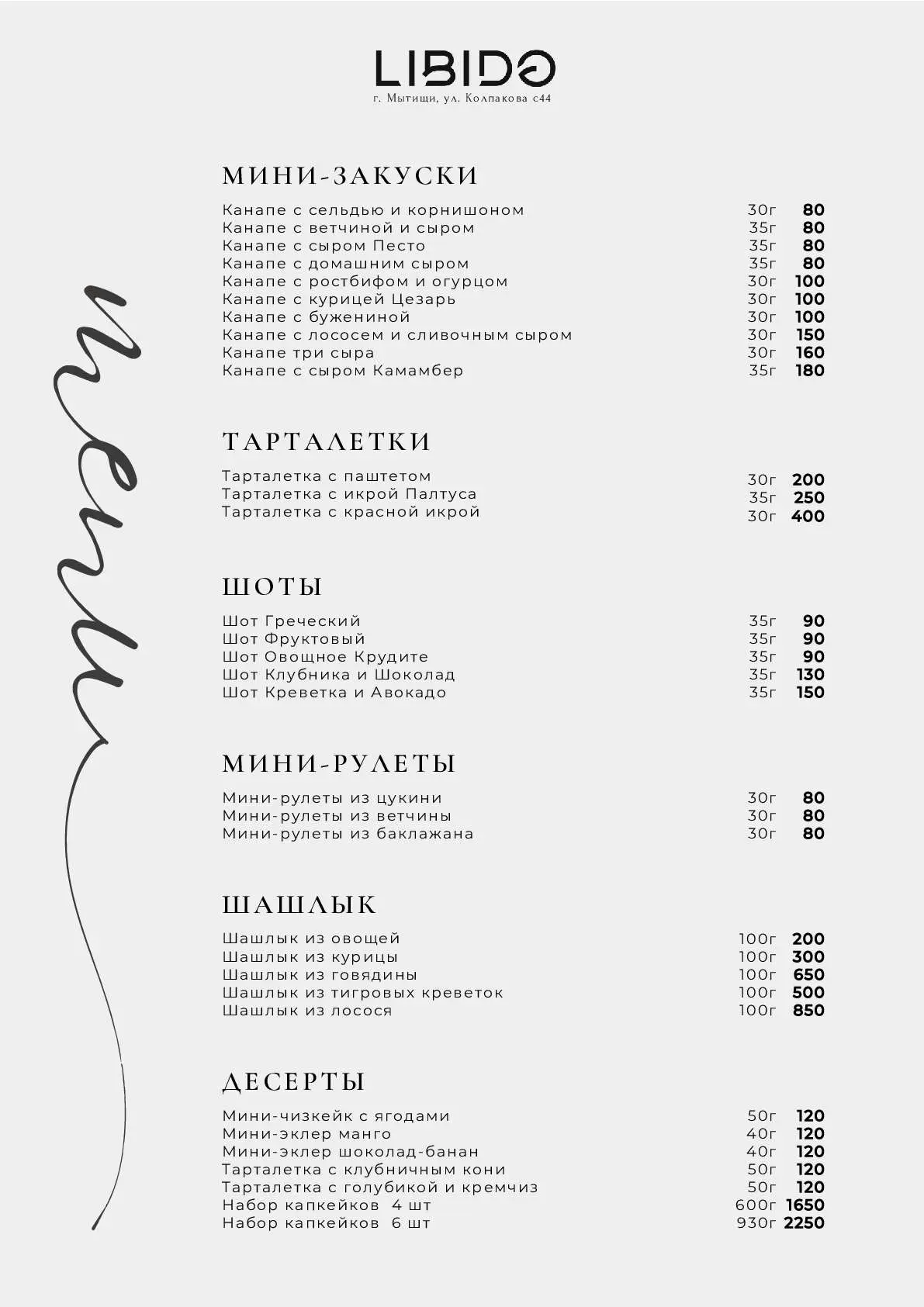 Главная идея ресторана Libido – выразить индивидуальность и креативный подход к кулинарии. Заведение гармонично сочетает вкусную еду и чувственный стиль. Здесь стремятся не только сытно накормить, но и показать ценность уникальных вкусов. Если желаете побаловать себя чем-то особенным, приходите сюда. Изысканные блюда европейской кухни, приготовленные по индивидуальным рецептам, удовлетворят даже самые экстравагантные вкусы.