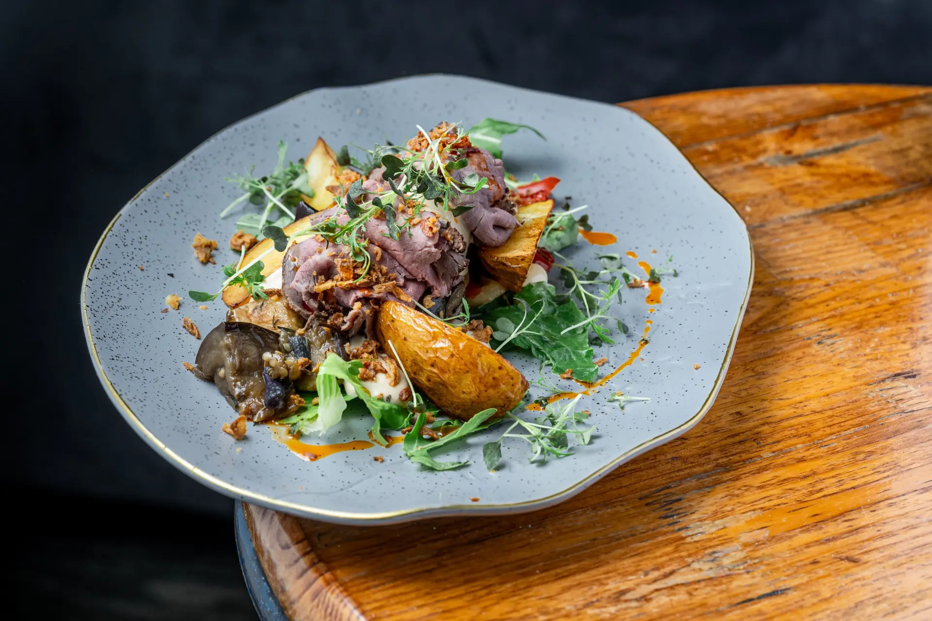 Салат с ростбифом и печёными овощами под медово-горчичным соусом640 руб.