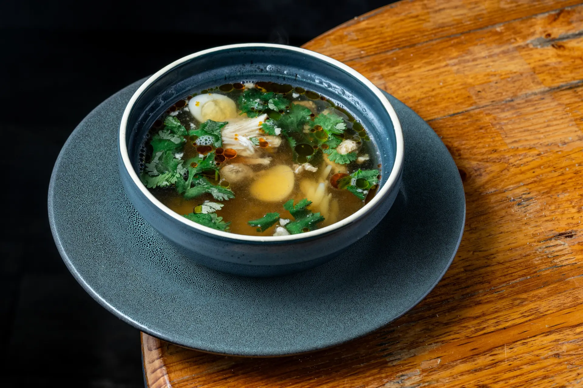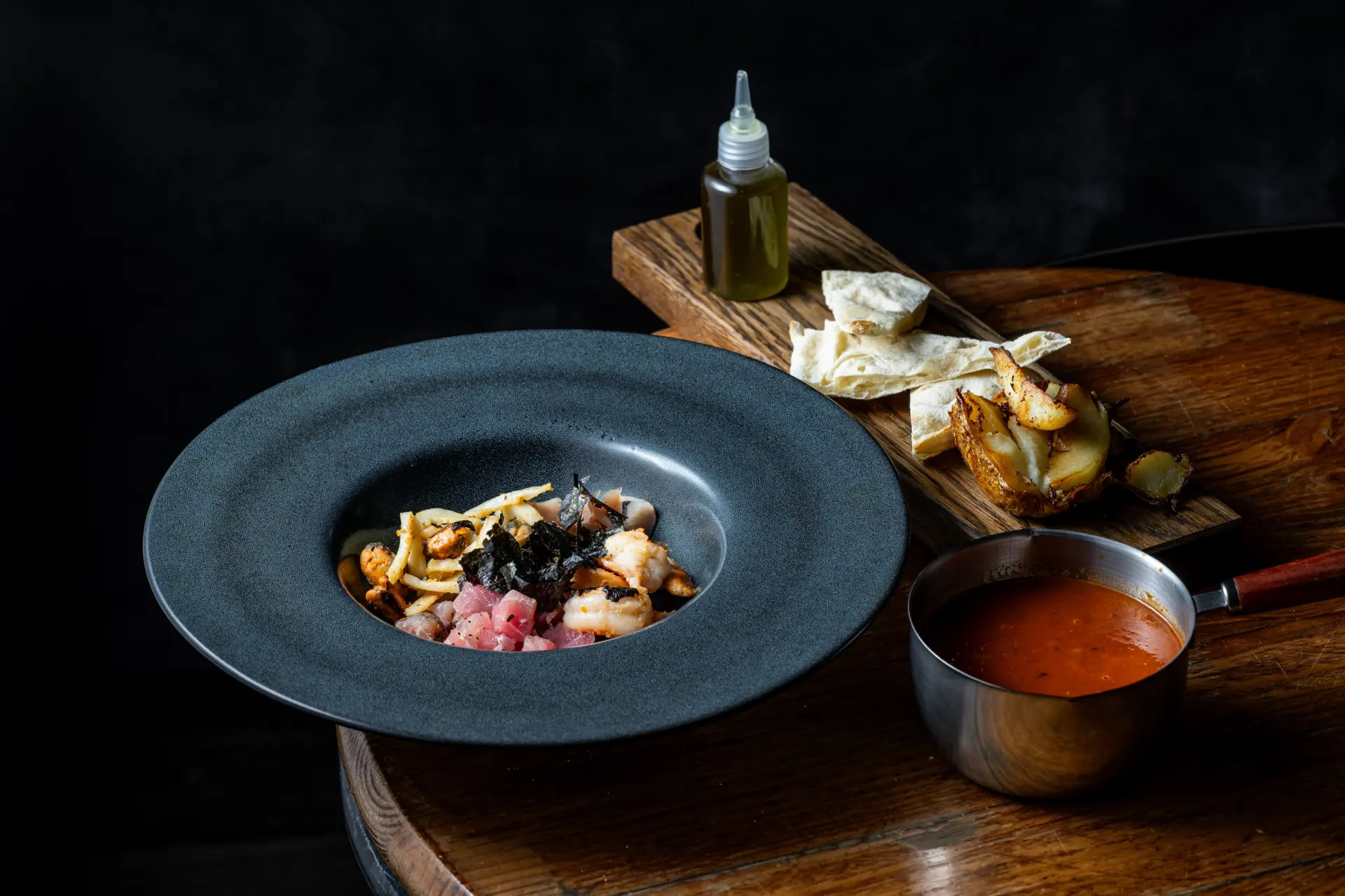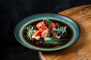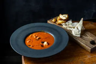 Томатный суп с морепродуктами и пылью из нори820 руб.