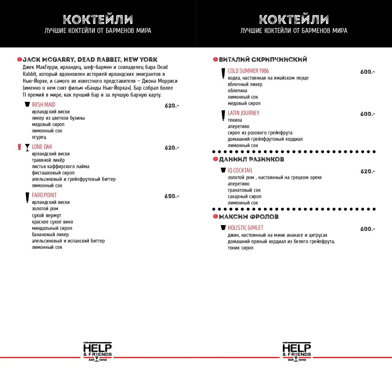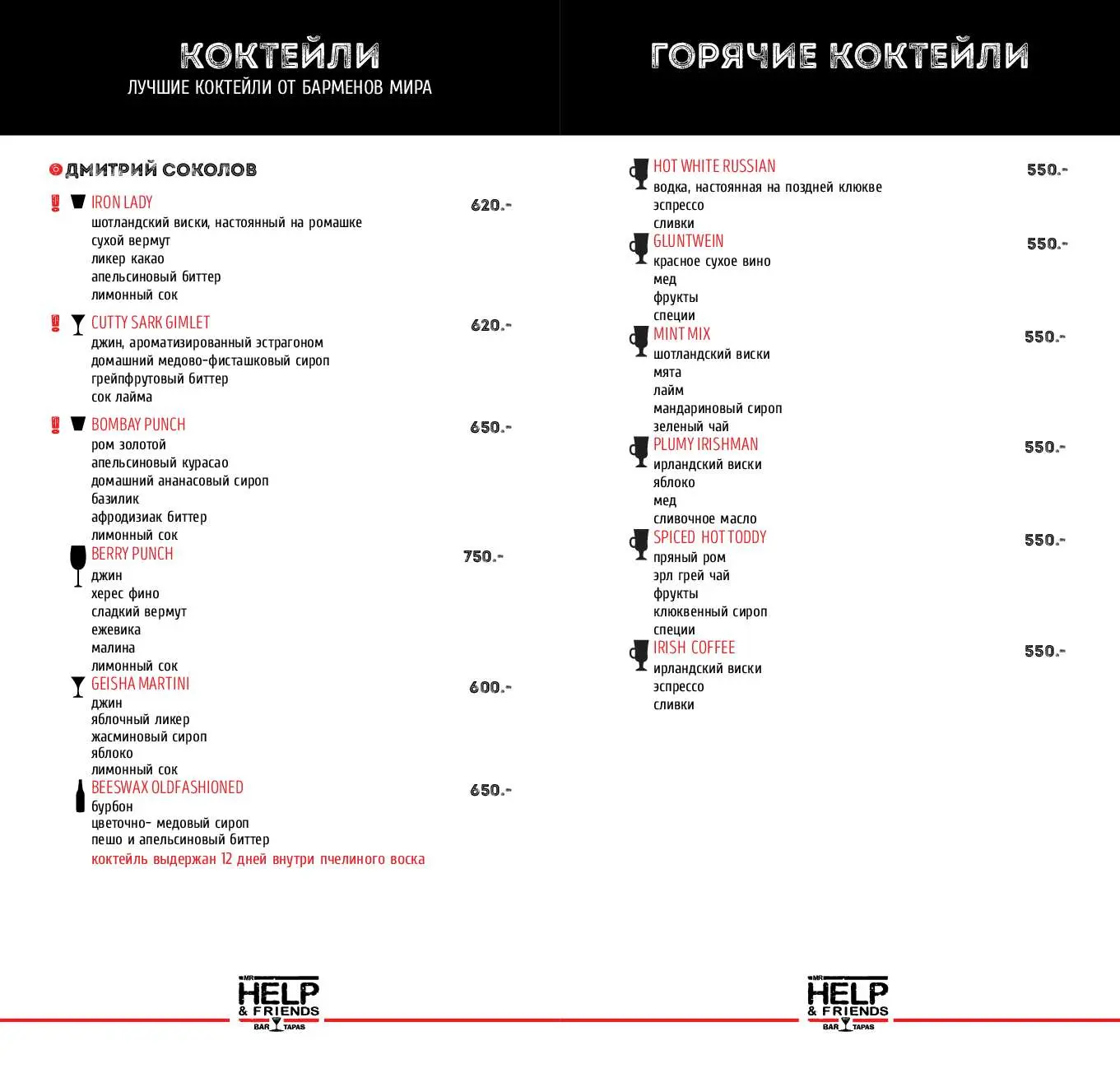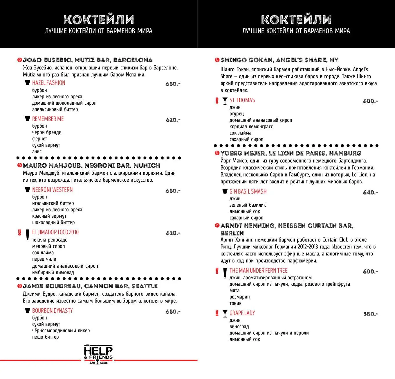 Бар Mr. Help and Friends на «Белорусской» существует уже много лет. Фактически это первый коктейльный бар в столице, открытый на территории бывшего СССР. Владелец Дима Соколов — двукратный чемпион мира по барменскому искусству, поэтому он и его команда создают образцовые напитки.