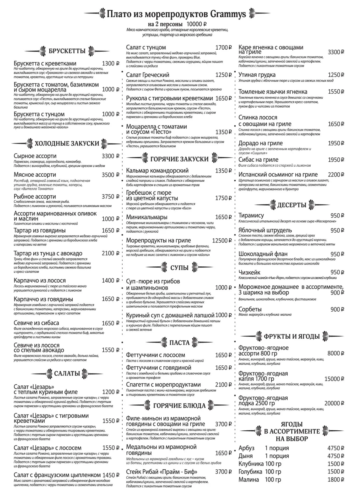 Плато из морепродуктов Grammys (на 2 персоны)Мясо камчатского краба, отварные королевские креветки, устрицы, тартар из морского гребешка10000 руб.