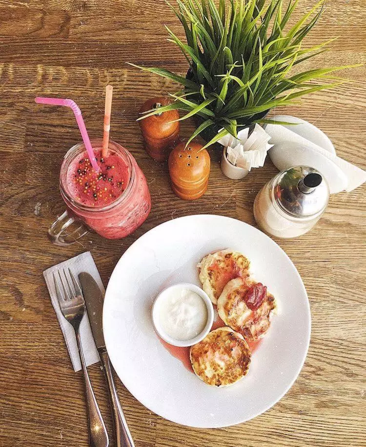 Русский завтрак (520 гр.)Сырники со сметаной, яичница из трёх яиц с луком и ветчиной, тост с клубничным джемом, кофе на выбор480 руб.