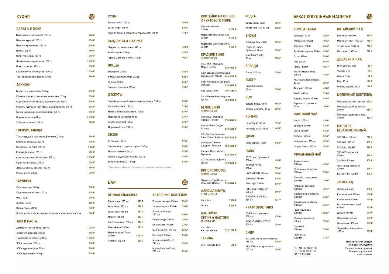 Если проголодались, то вас порадуют супами, сэндвичами, салатами и другими блюдами, которые вполне способны удивить и гурмана. А барное меню предложит любимые алкогольные и безалкогольные напитки. С 12:00 до 17:00 можно заказать бизнес-ланч.