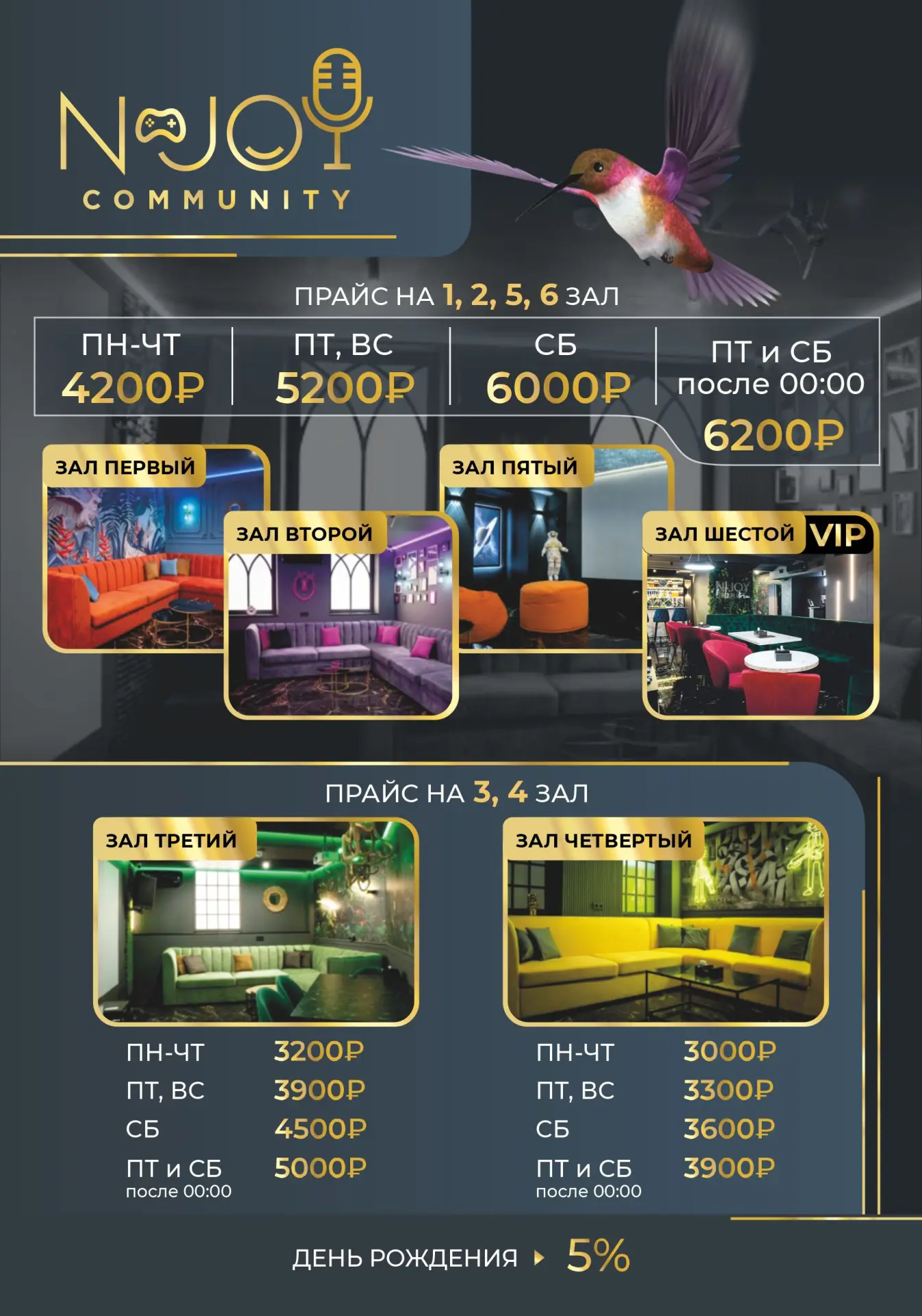 Караоке-кабинка/комната: ПятыйСтолов: 2; Посадочных мест: 25; Этаж: -1.Суббота | с 00:00 до 24:00Аренда час от 6000 ₽