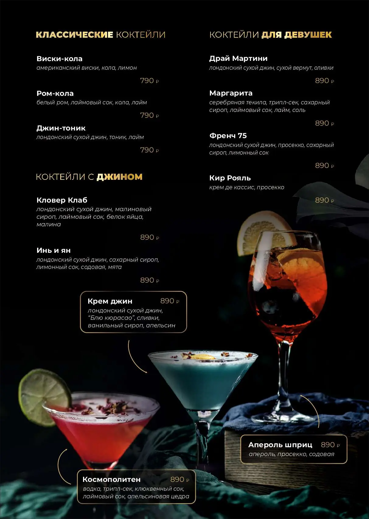 Инь и янлондонский сухой джин, сахарный сироп, лимонный сок, содовая, мята890 руб.
