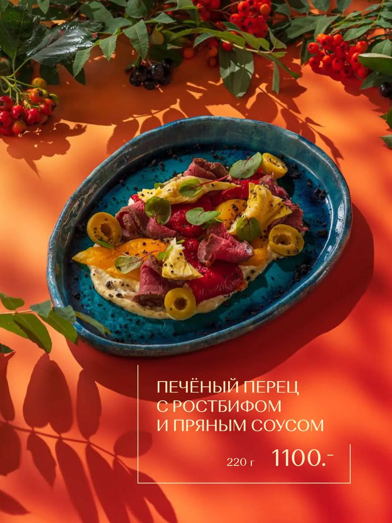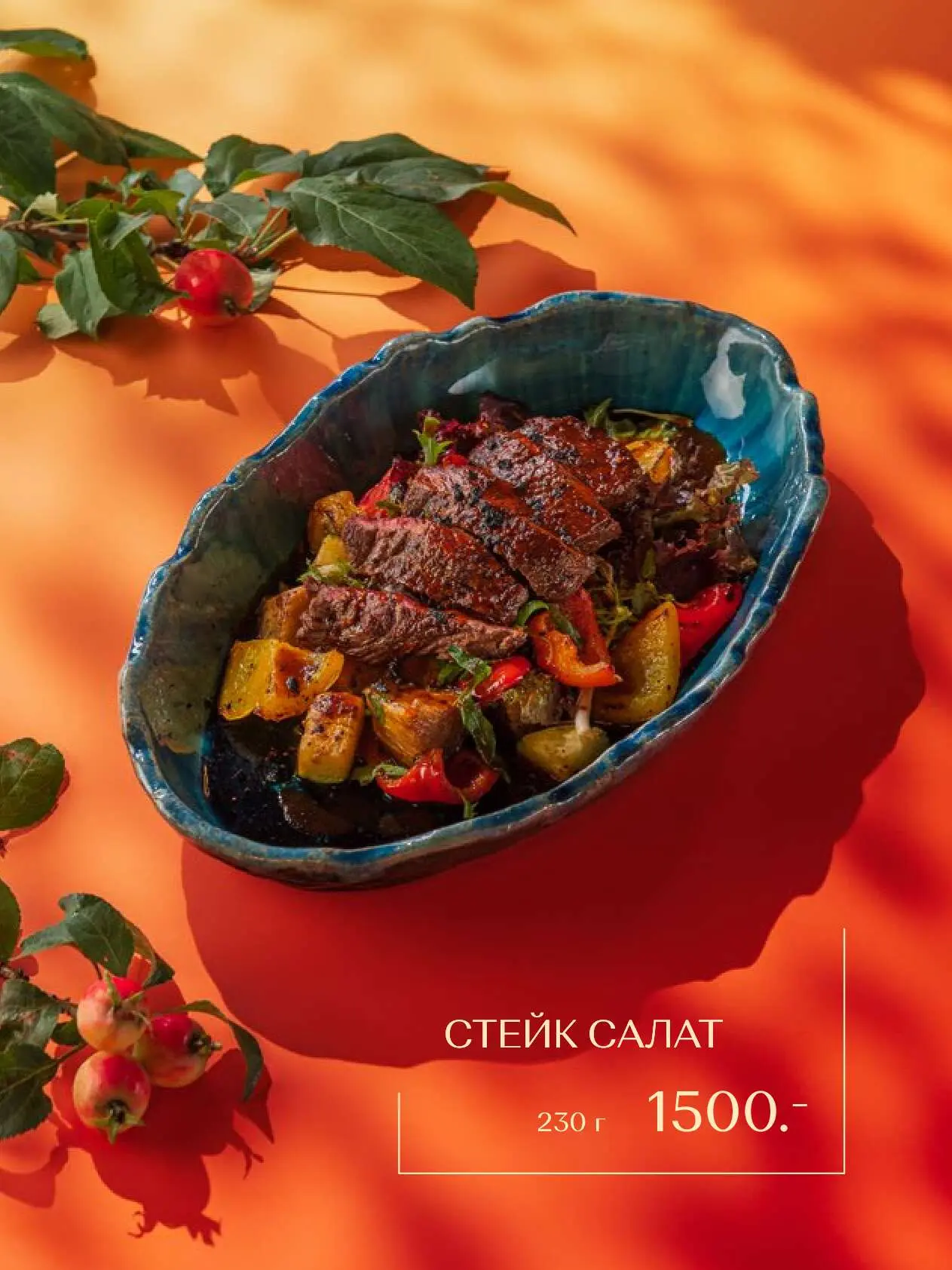 Обжаренные в дровяной печи: стейк «Рибай», филе миньон, каре ягненка, цыпленок табака, куриный шашлык, овощи гриль, бейби картофель. Подается с тремя соусами: сальса, пейпер, чили сладкий