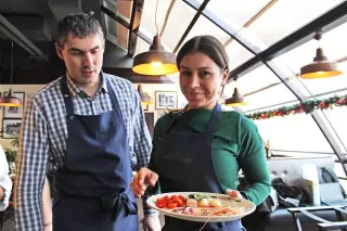 Гудман-кебаб с мраморной говядиной (285/50 г)Мраморная говядина с огурцами и томатами в соусах дзадзики и айоли в хрустящей тортилье. Украшается песто из запеченных баклажанов, миксом салатов с томатами черри и перцем халапеньо.920 руб.