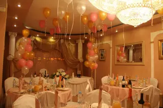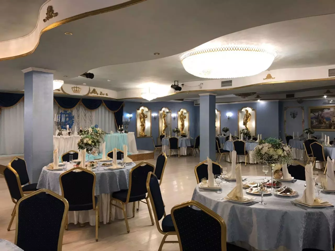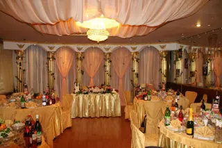 Здесь предлагают три зала разной вместительности – для небольшой компании на 10 человек или для большого празднества на 400 гостей. В интерьере – нестареющая классика в светлых тонах, с роскошными светильниками, багетным обрамлением, античными статуями и даже камином. На стенах висят бра-канделябры и картины в красивых дорогих рамах.