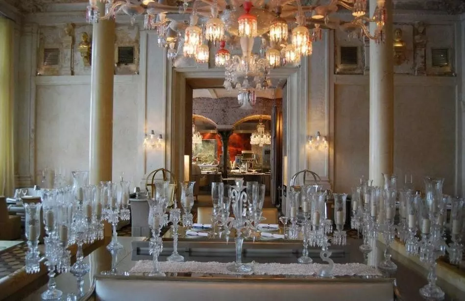 «Baccarat» — известный бренд, под названием которого изготавливают хрустальные изделия, и заведение названо так не случайно, ведь это настоящий хрустальный замок. И проявляется это во всём — даже в экстерьере особняка, в котором находится заведение. Высокие окна, изысканные статуи, изящные колонны с резной капителью — всё это создаёт эффект лёгкости и воздушности.