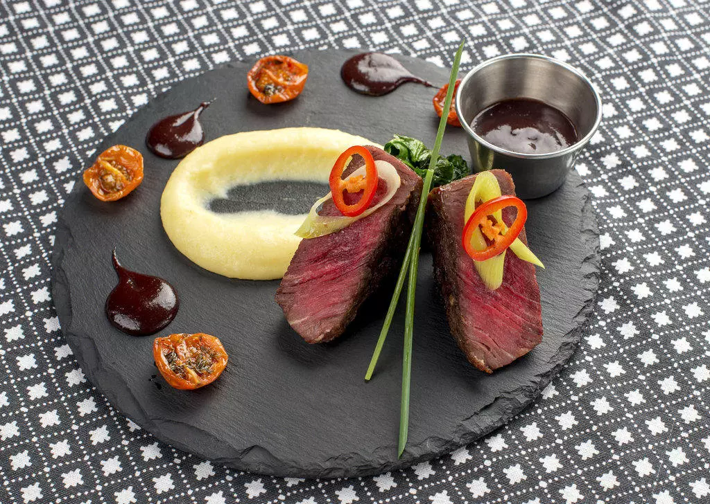Бифштекс из мраморной говядины зернового откорма с сыром дор блю780 руб.