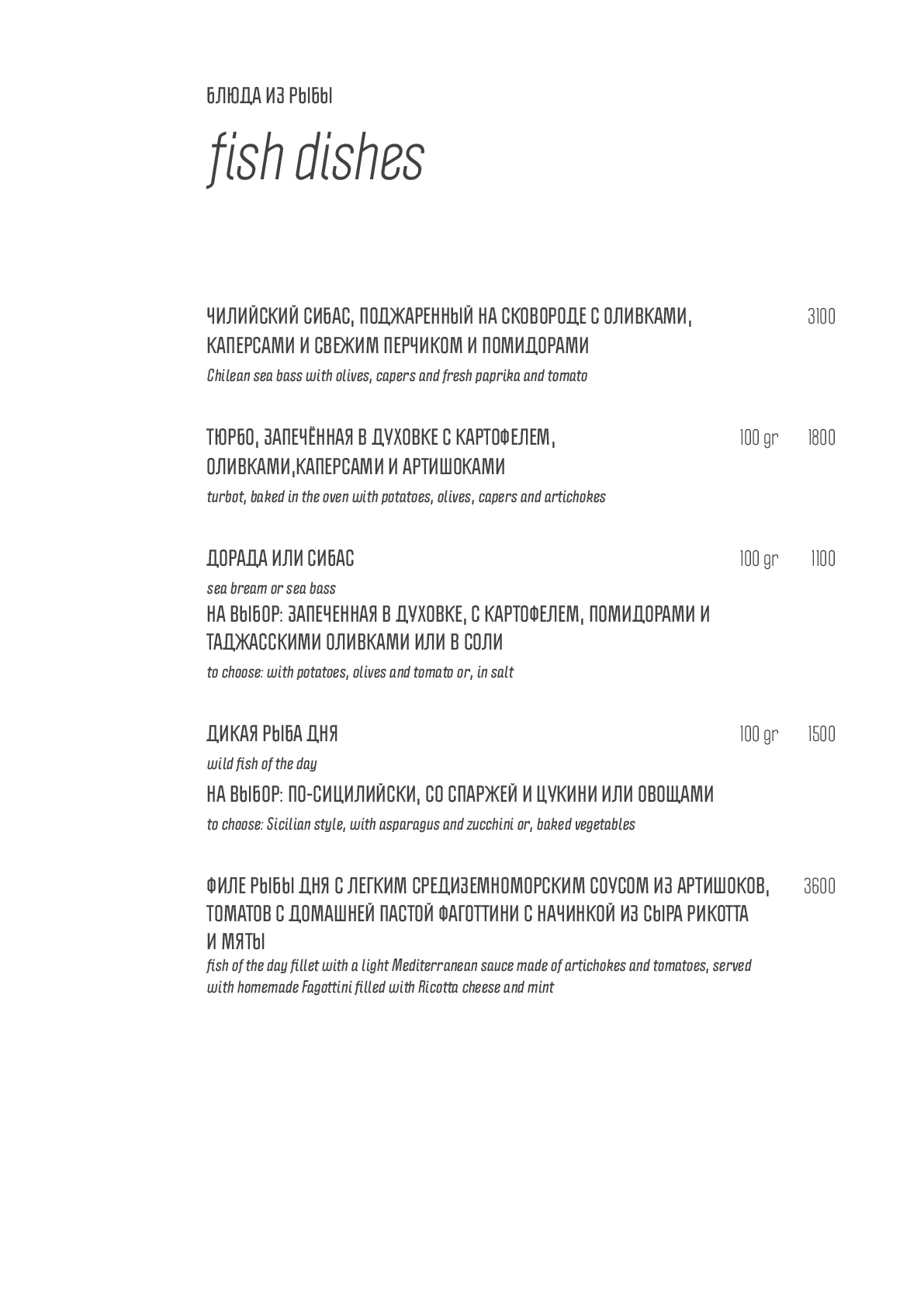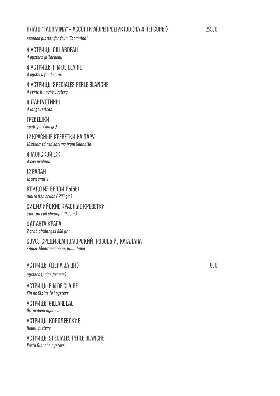 Плато “TAORMINA” – ассорти морепродуктов (на 4 персоны)4 устрицы GILLARDEAU 4 oysters gillardeau 4 Устрицы FIN DE CLAIRE 4 oysters fin de clair 4 устрицы SPECIALES PERLE BLANCHE 4 Perle Blanche oysters 4 ЛАНГУСТИНЫ 4 langoustines Гребешки scallops (160 gr) 12 красные креветки на пару 12 steamed red shrimp from Sakhalin 4 морской еж 4 sea urchins 12 рапан 12 sea snails Крудо из белой рыбы white fish crudo ( 200 gr ) Сицилийские Красные креветки sicilian red shrimp ( 250 gr ) Фаланга краба 2 crab phalanges 350 gr Соус: Средиземноморский, Розовый, Каталана25500 руб.