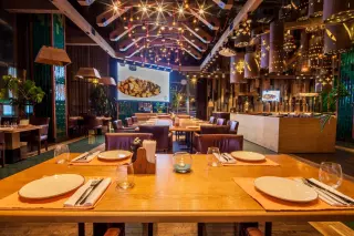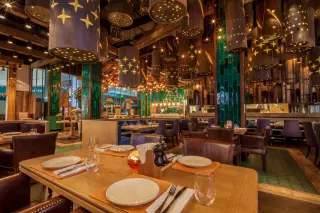 Заведение располагает двумя залами. Просторный основной зал оформлен в соответствии с канонами лофта и фьюжн, гармонично переплетенных между собой. Светлое и темное дерево, обилие зелени, крошечные светильники и массивные абажуры, украшенные звездами. Все это создает впечатление, будто вы оказались в другом измерении. А панорамные окна позволяют наблюдать за жизнью столицы и не терять связь с реальностью. Для маленьких компаний предлагается VIP комната.