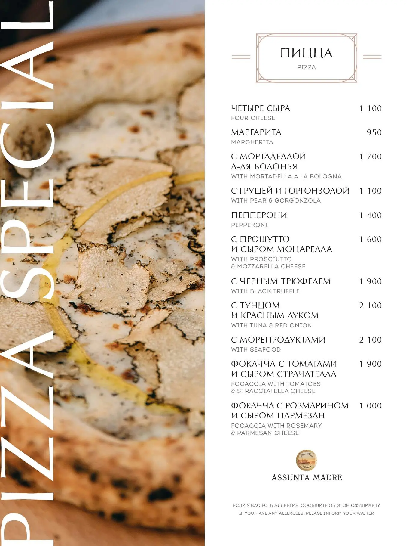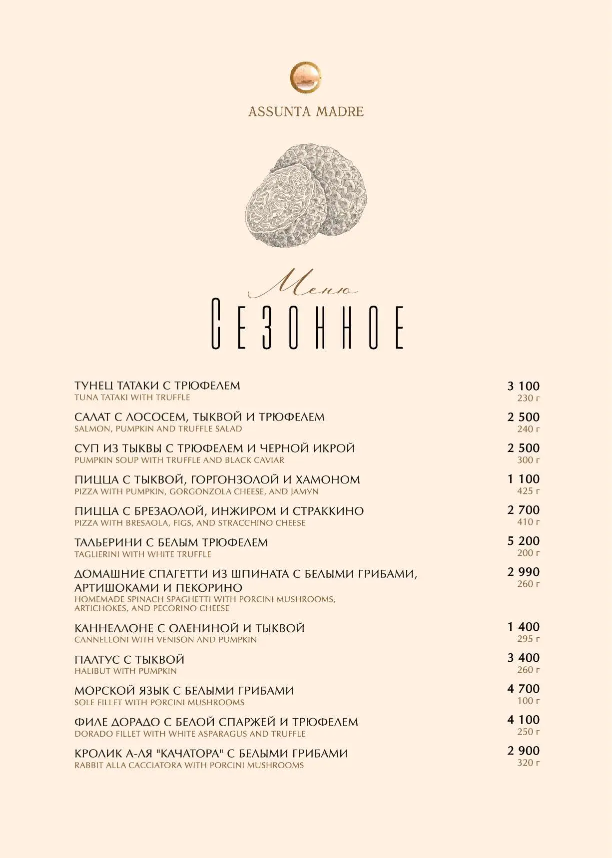Специально к празднику команда Assunta Madre создала новогодний сет на две персоны. В него вошли холодные закуски: вителло тоннато, брускетта с говядиной и рукколой, севиче из лосося, авторская интерпретация оливье с креветками и традиционное блюдо праздничного стола — сельдь под шубой. В качестве горячих закусок гостям предложат равиоли с кроликом и шалателли с креветками. Меню также включает в себя горячие блюда — филе дорадо и утка-корнишон. В завершении ужина подадут десерт — медовик. Праздничный сет будет сопровождаться игристым вином.