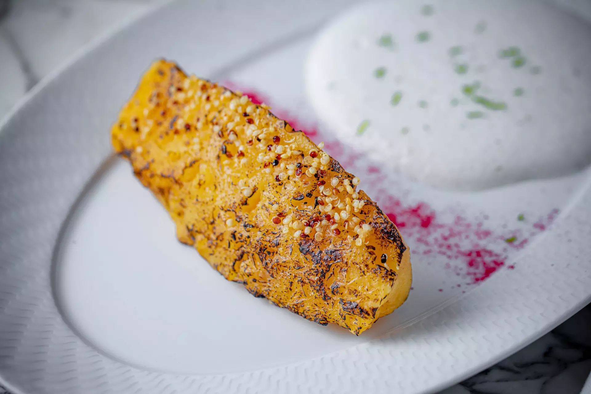 Морской гребешок, пюре «Робюшон» (80/120/40 гр.)соус «Бер Блан» с трюфелем и корнем хрена1790 руб.