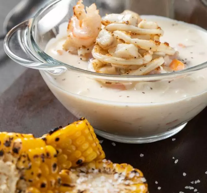 ЧАУДЕР С КОРОЛЕВСКИМИ КРЕВЕТКАМИ, КАЛЬМАРОМ И ТРЕСКОЙ (330/80/5 г)Суп чаудер с морепродуктами: креветки, кальмар, филе трески. Початок кукурузы380 руб.
