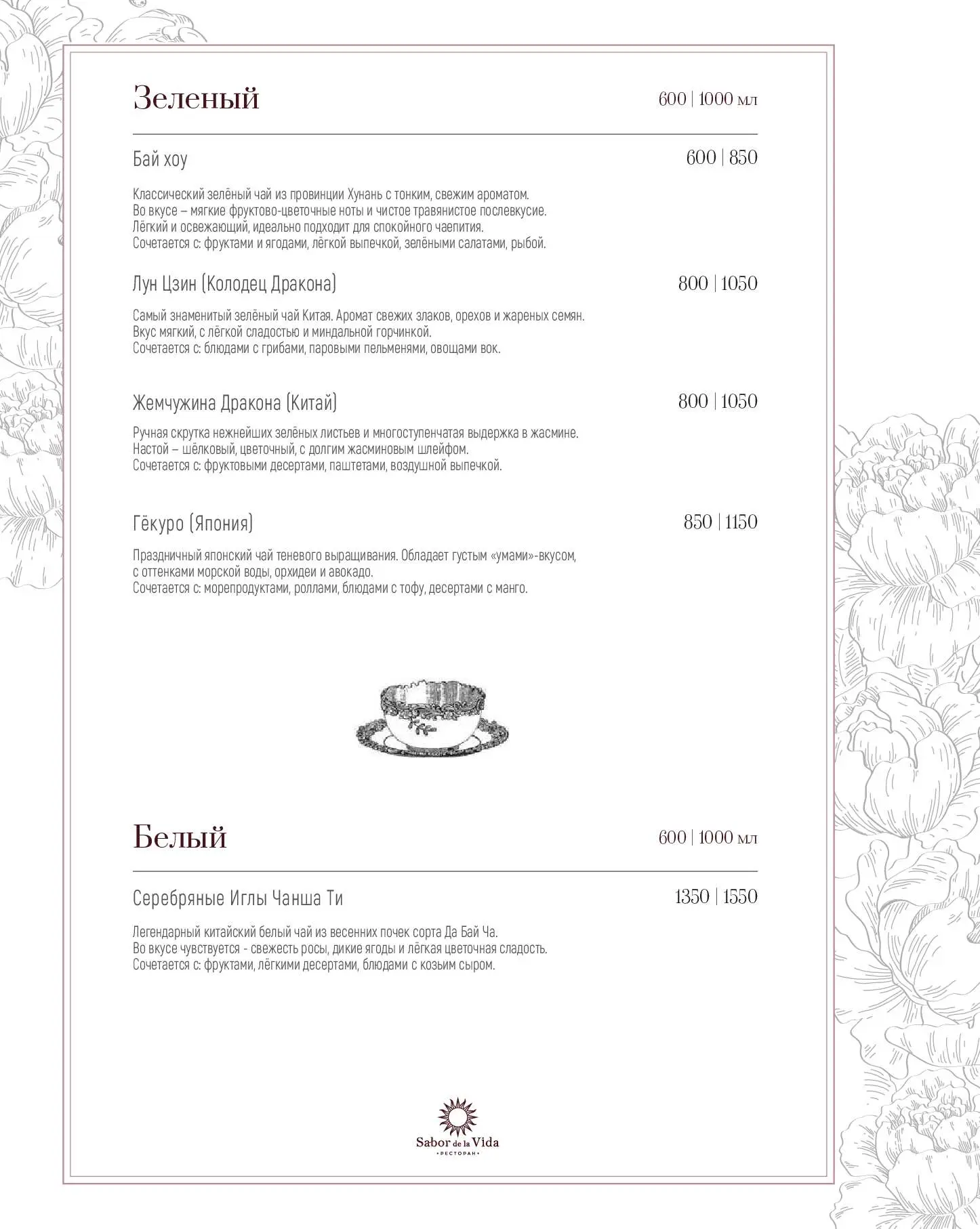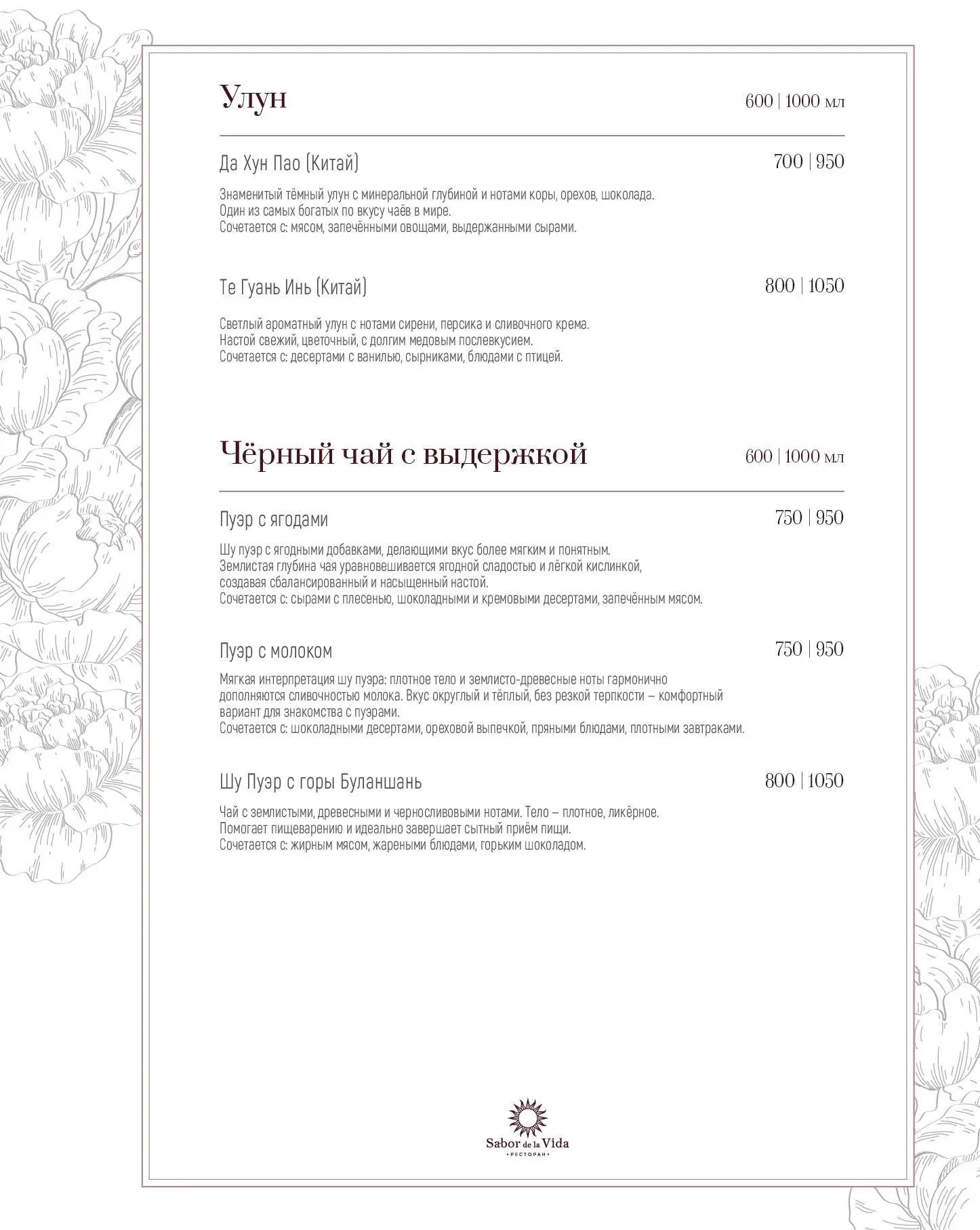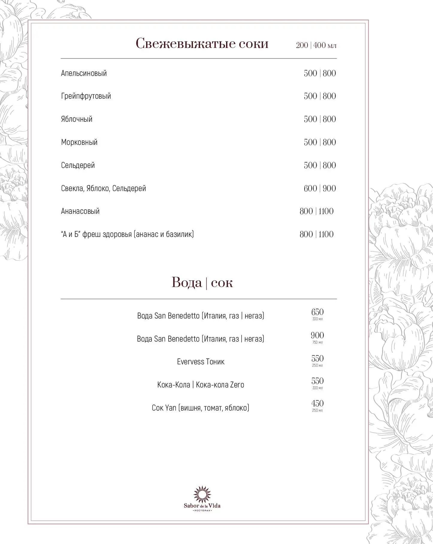 Еще одна гордость ресторана «Сабор де ла Вида» — обширная винная карта, состоящая из более 160 позиций (10 из них представлено по бокалам). Здесь можно попробовать вина, эксклюзивно привезенные из Испании.