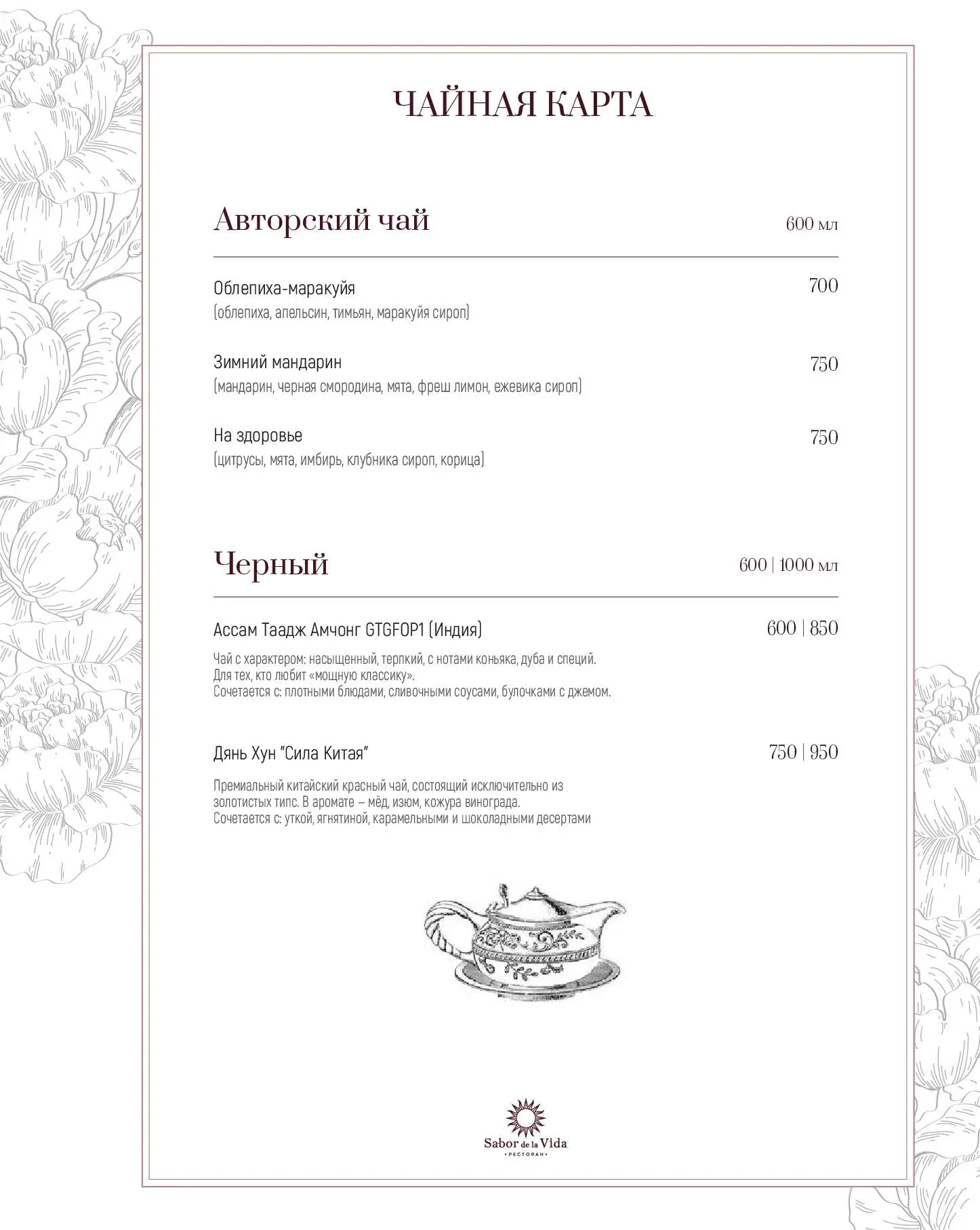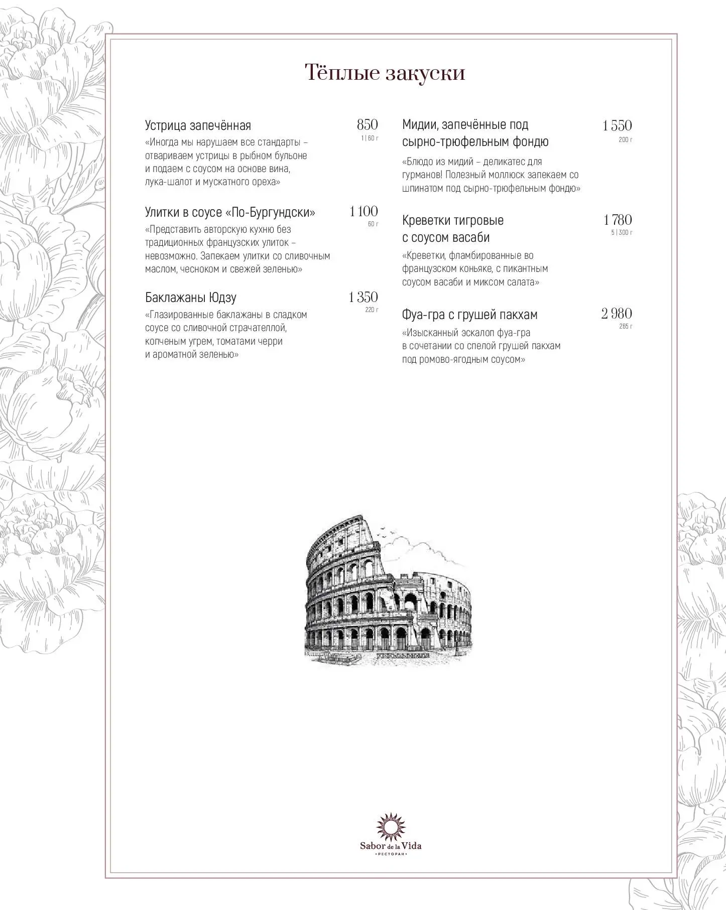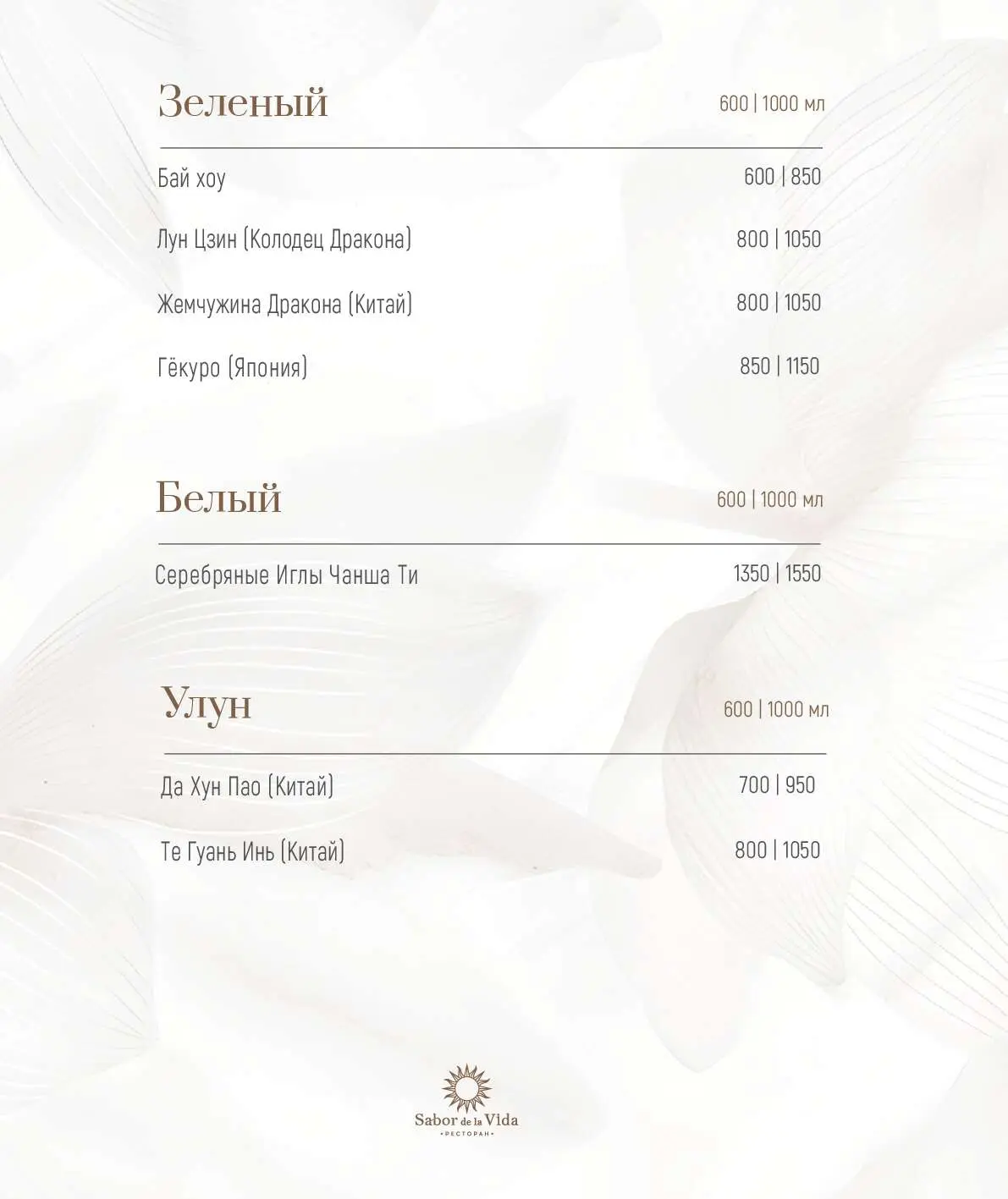 Еще одна гордость ресторана «Сабор де ла Вида» — обширная винная карта, состоящая из более 160 позиций (10 из них представлено по бокалам). Здесь можно попробовать вина, эксклюзивно привезенные из Испании.