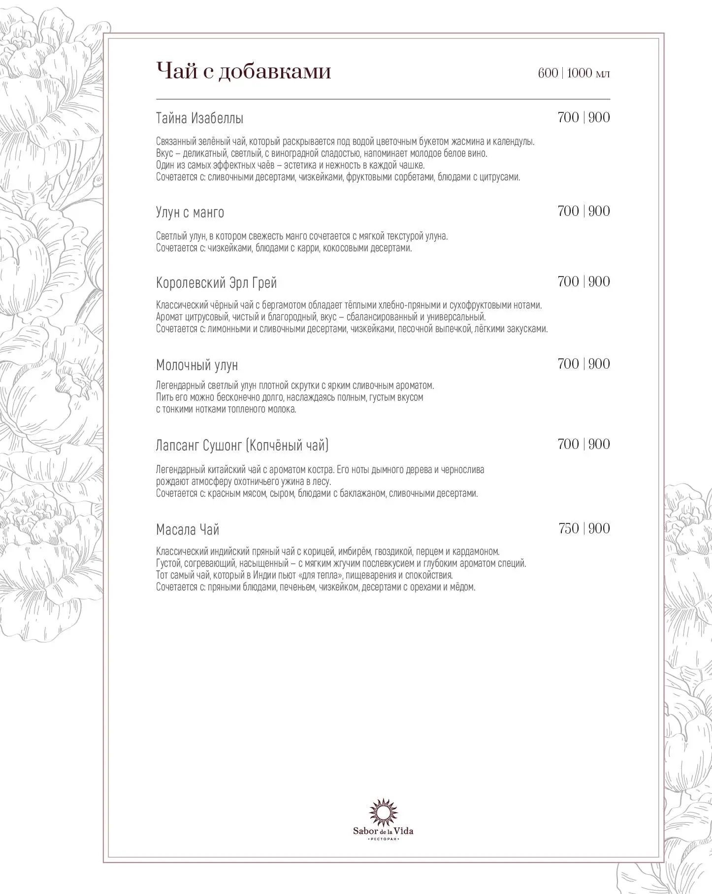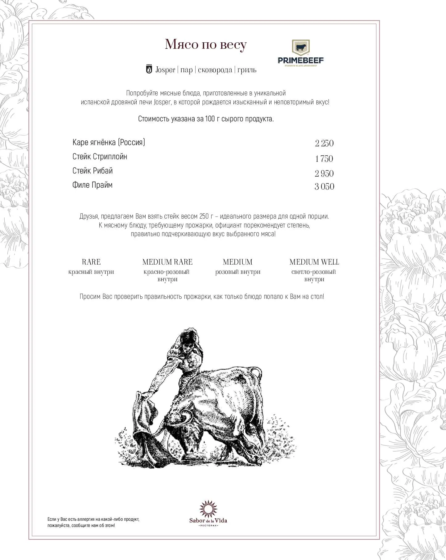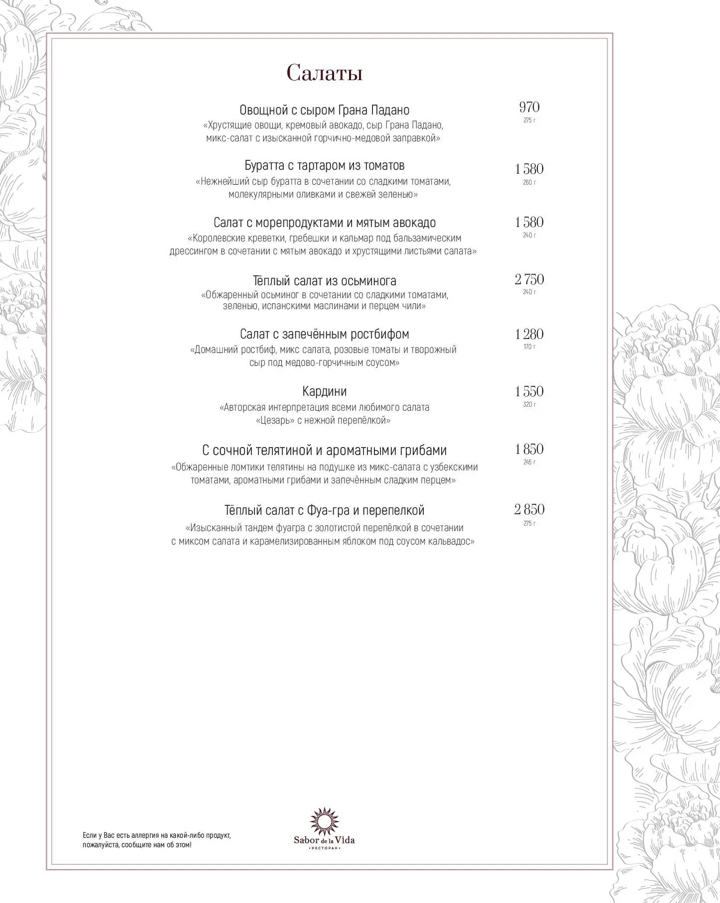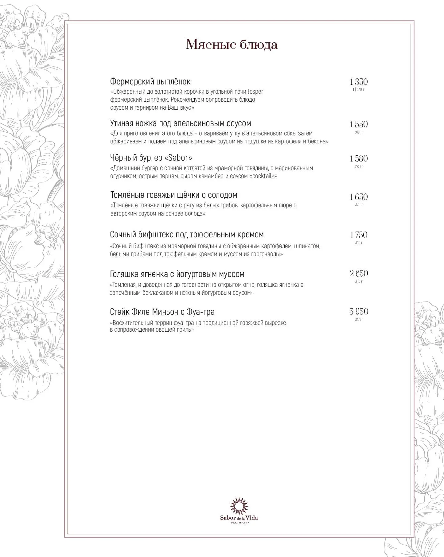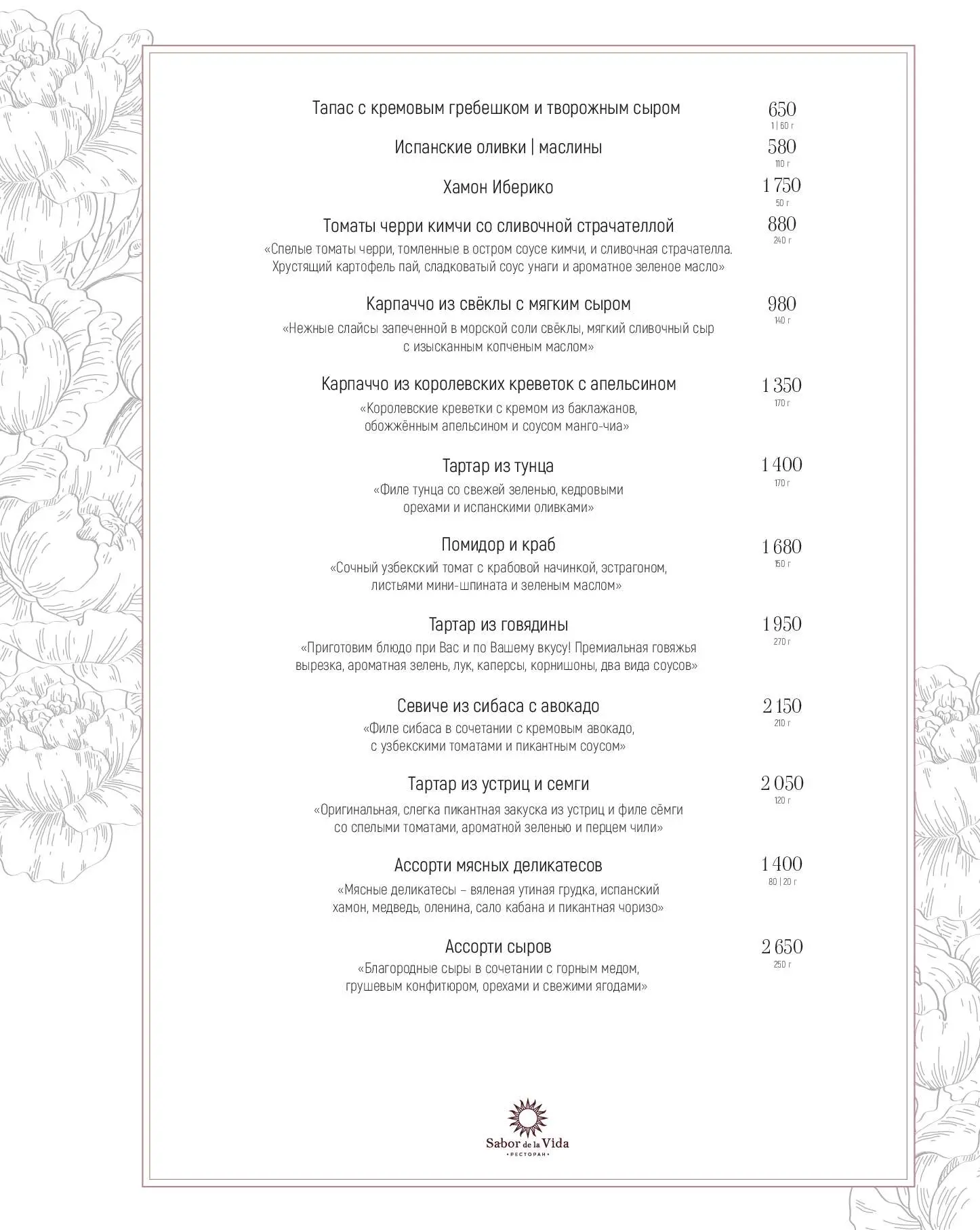 Название ресторана Sabor de la Vida на улице 1905 года переводится с испанского как «Вкус жизни». И здесь есть все, чтобы его ощутить: восхитительные блюда европейской кухни, широкий выбор вин, живая музыка, безупречный сервис, сигарные комнаты и салон элитного алкоголя и сигар. Для гурманов — премиальные стейки, приготовленные в испанской дровяной печи Josper, и живые морепродукты.