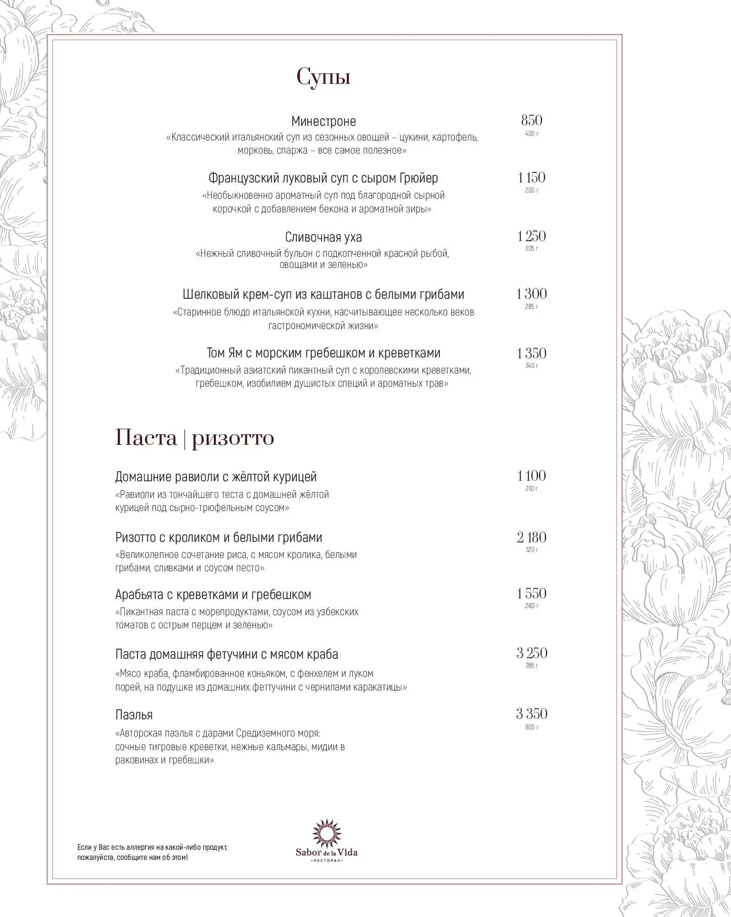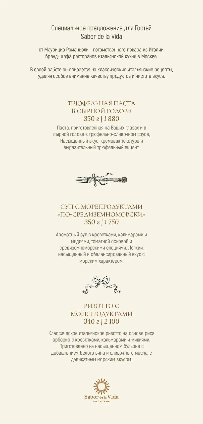 Гостеприимство, уют, красота и профессионализм отличают ресторан Sabor de la Vida. Здесь готовят замечательные авторские блюда, бережно заботятся о каждом клиенте, а также предлагают побаловать себя элитными винами и ароматными сигарами.