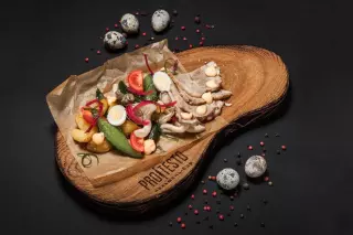 Дровосек/Woodcutterсалат с томленои буженинои, печеным картофелем, битыми огурцами и перепелиным яицом370 руб.
