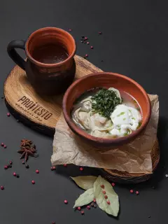 Борщ/Borschс соленои грудинкои и копченои сметанои390 руб.