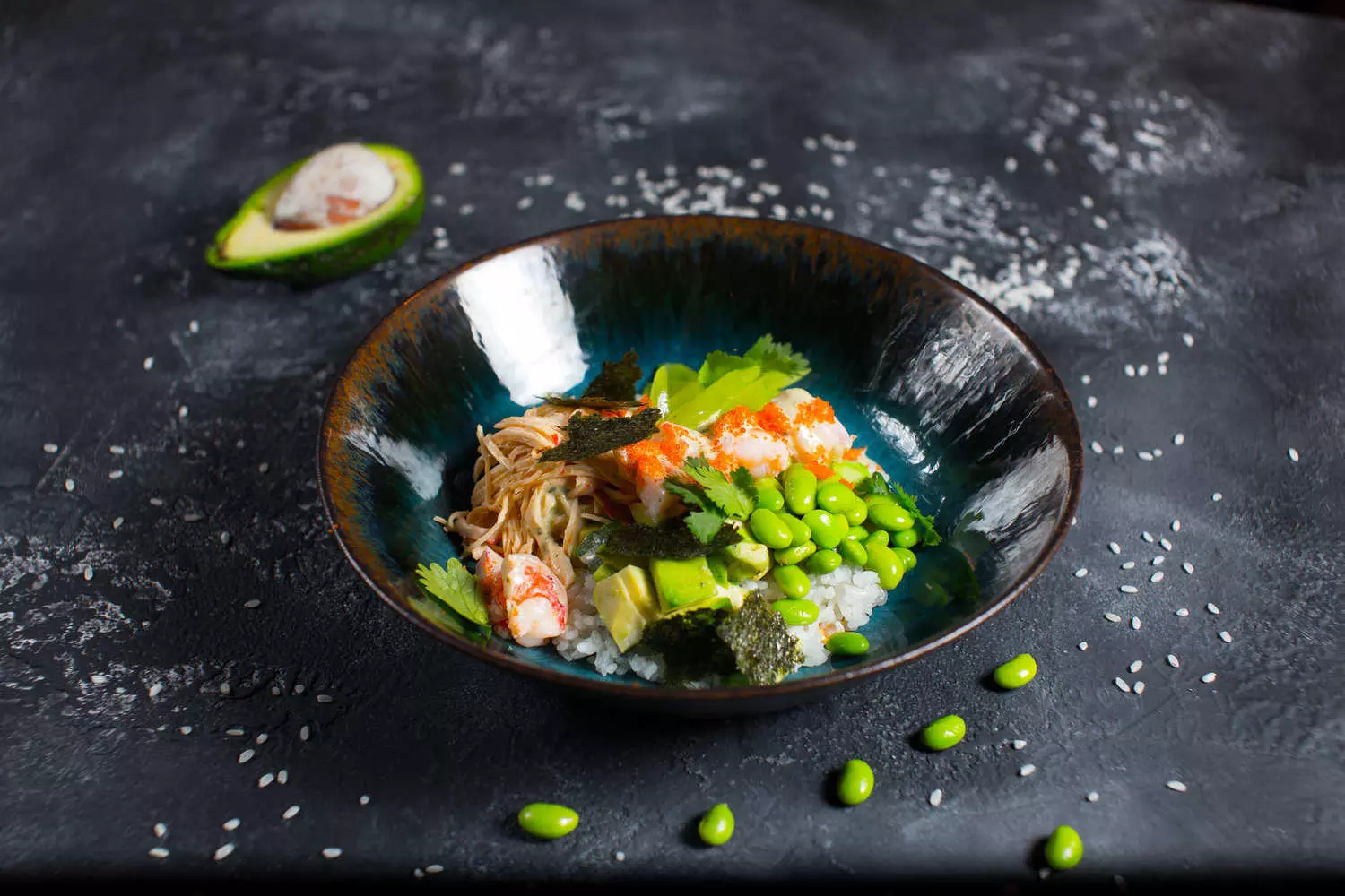 Поке с крабом/Poke with crabпоке со снежным крабом, креветками, сливочным васаби, на подушке из риса с авокадо и бобами эдамаме590 руб.