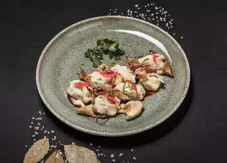 Пельмени «Мясника»/Butcher dumplingsмраморная телятина с карамельным луком,? соусом «Сливочныи Деми» и стеиком из печени по-венециански450 руб.