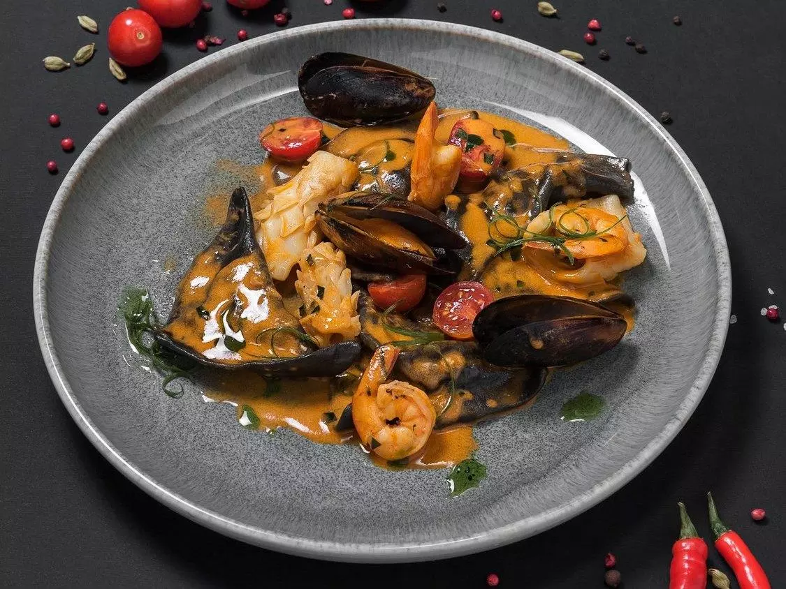 Тальятелле/Tagliatelleс креветками, кальмарами, мидиями и соусом «Биск»470 руб.