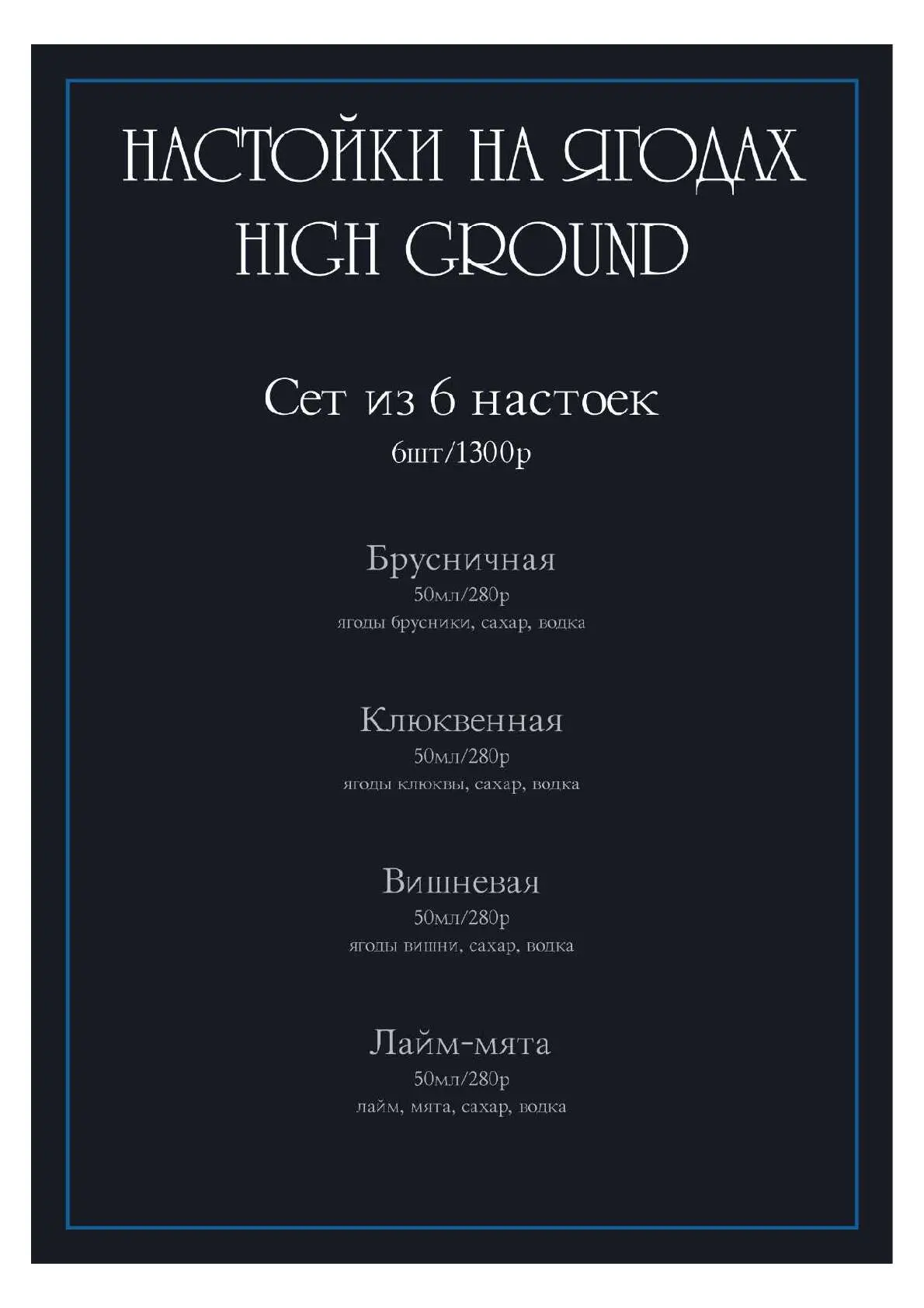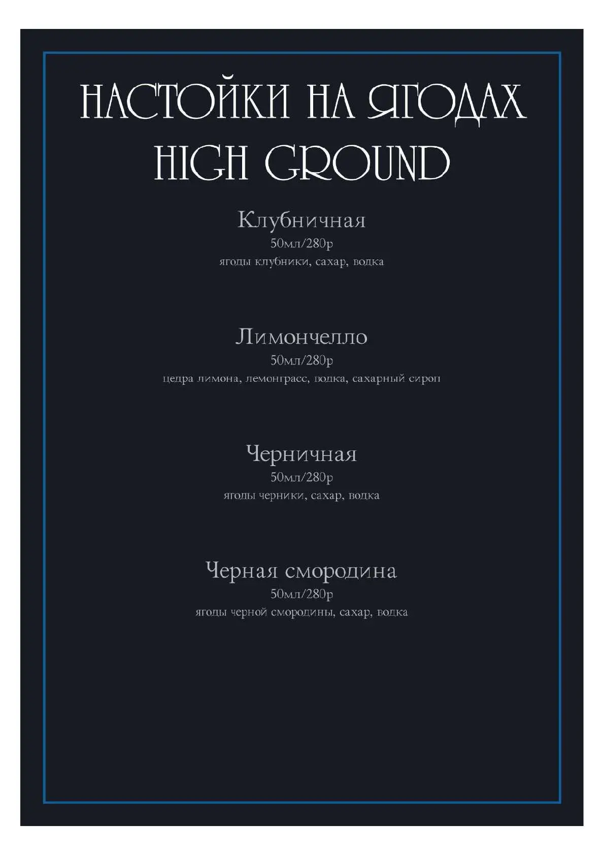 В баре «Хай Граунд» гостям предложат актуальные напитки и полноценное меню американской и европейской кухни. Здесь готовят изысканные салаты с морепродуктами, курицей, сыром, легкие барные закуски, аппетитную пасту в вариациях. Для перекуса в самый раз будут разные виды бургеров. Можно остановить свой выбор на средиземноморском или грибном супе, стейке из семги. Стоит отметить достаточные порции еды и удобно сбалансированные цены. Частью кулинарной программы являются завтраки. Бар наполнен бутылочным пивом, ароматными лимонадами, чайными напитками.
