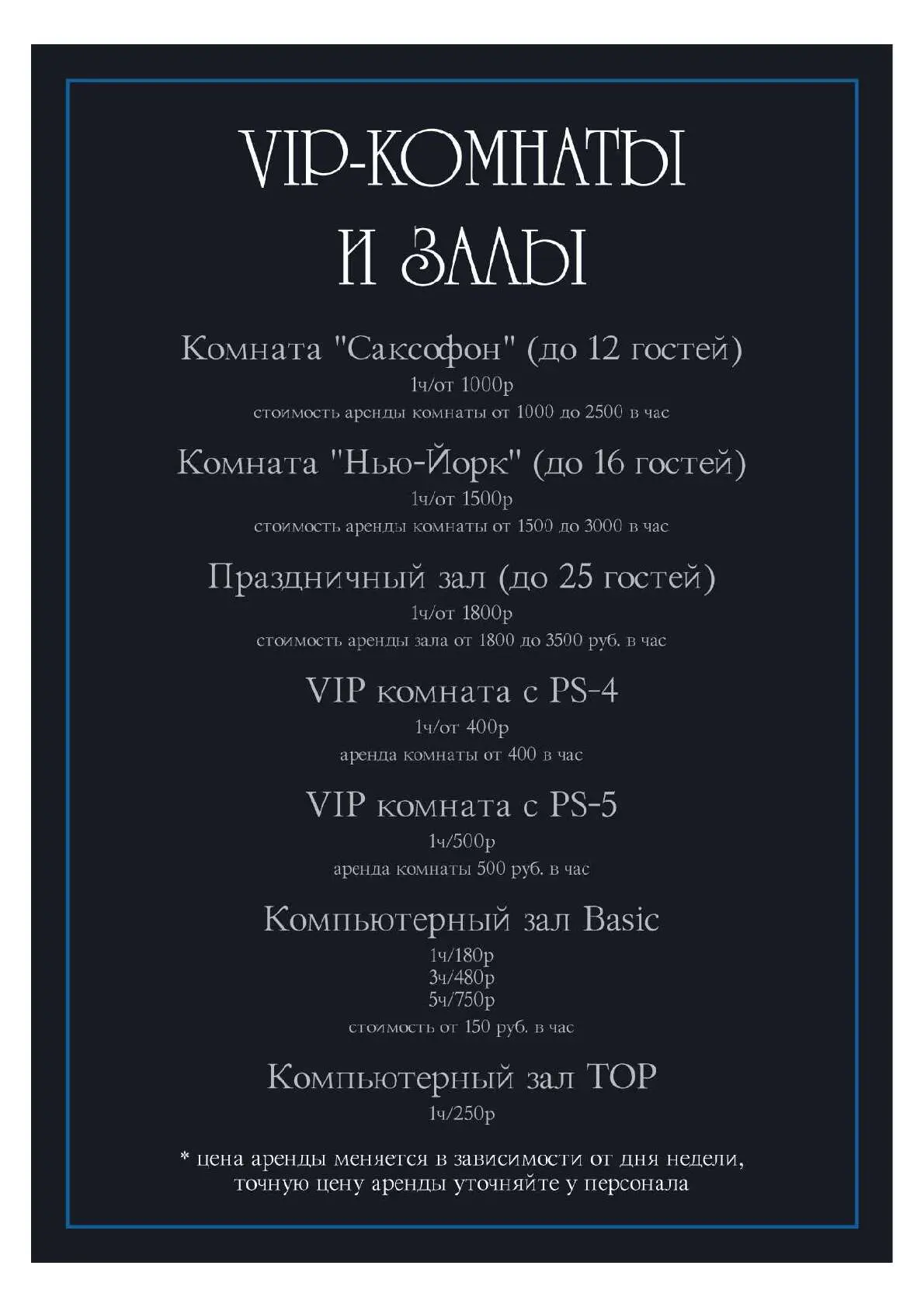 VIP 1Столов: 1; Посадочных мест: 8; Этаж: 2.PS-4. Кондиционер. Алкоголь можно с собой: безалкогольные- 150р., пиво-150 р., вино, шампанское-350 р., крепкий алкоголь-600 р. с бутылкиПонедельник - Среда | с 12:00 до 24:00Аренда час 400 ₽Четверг | с 12:00 до 24:00Аренда час 500 ₽Пятница | с 12:00 до 02:00Аренда час 600 ₽Суббота | с 12:00 до 02:00Аренда час 700 ₽Воскресенье | с 12:00 до 24:00Аренда час 500 ₽