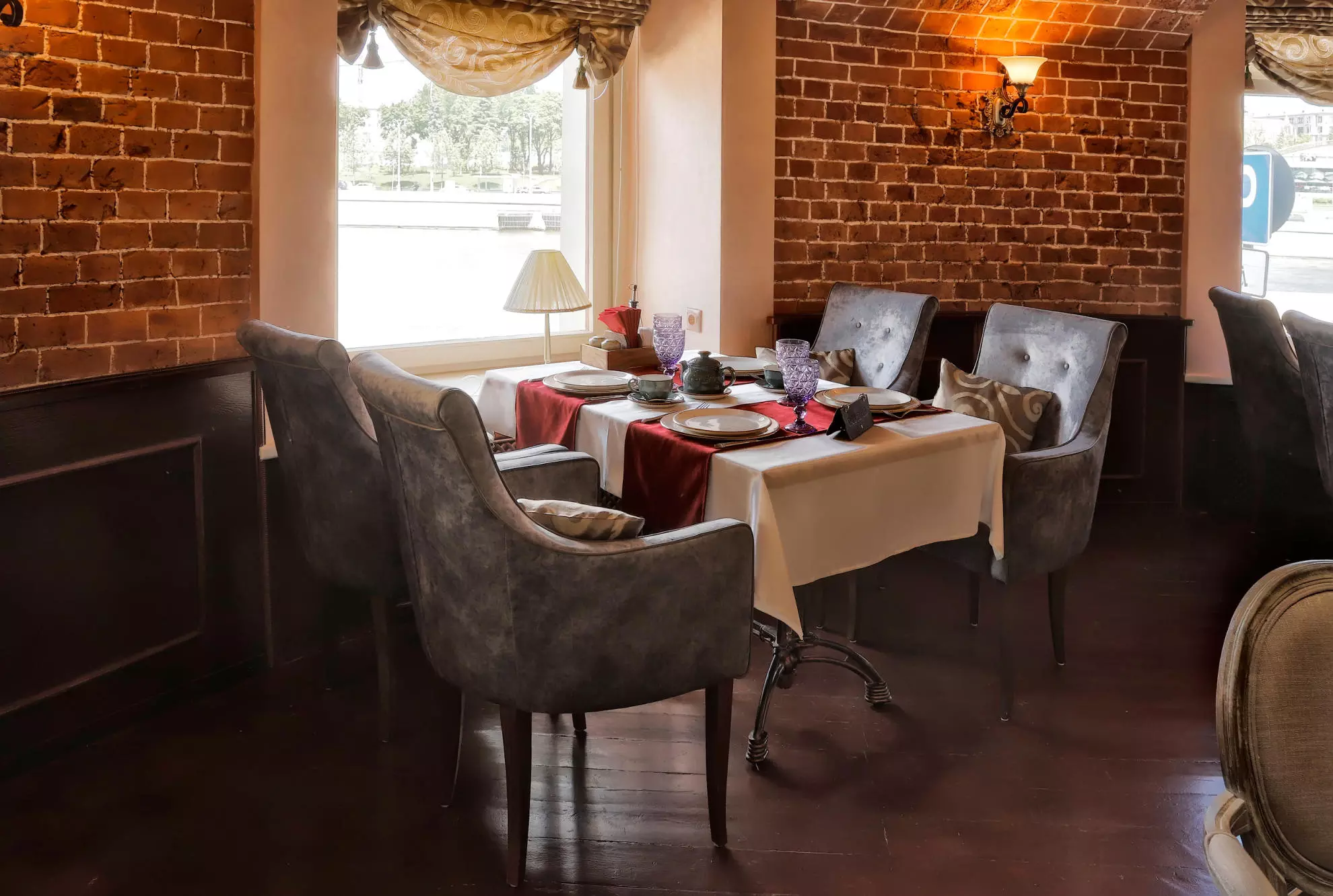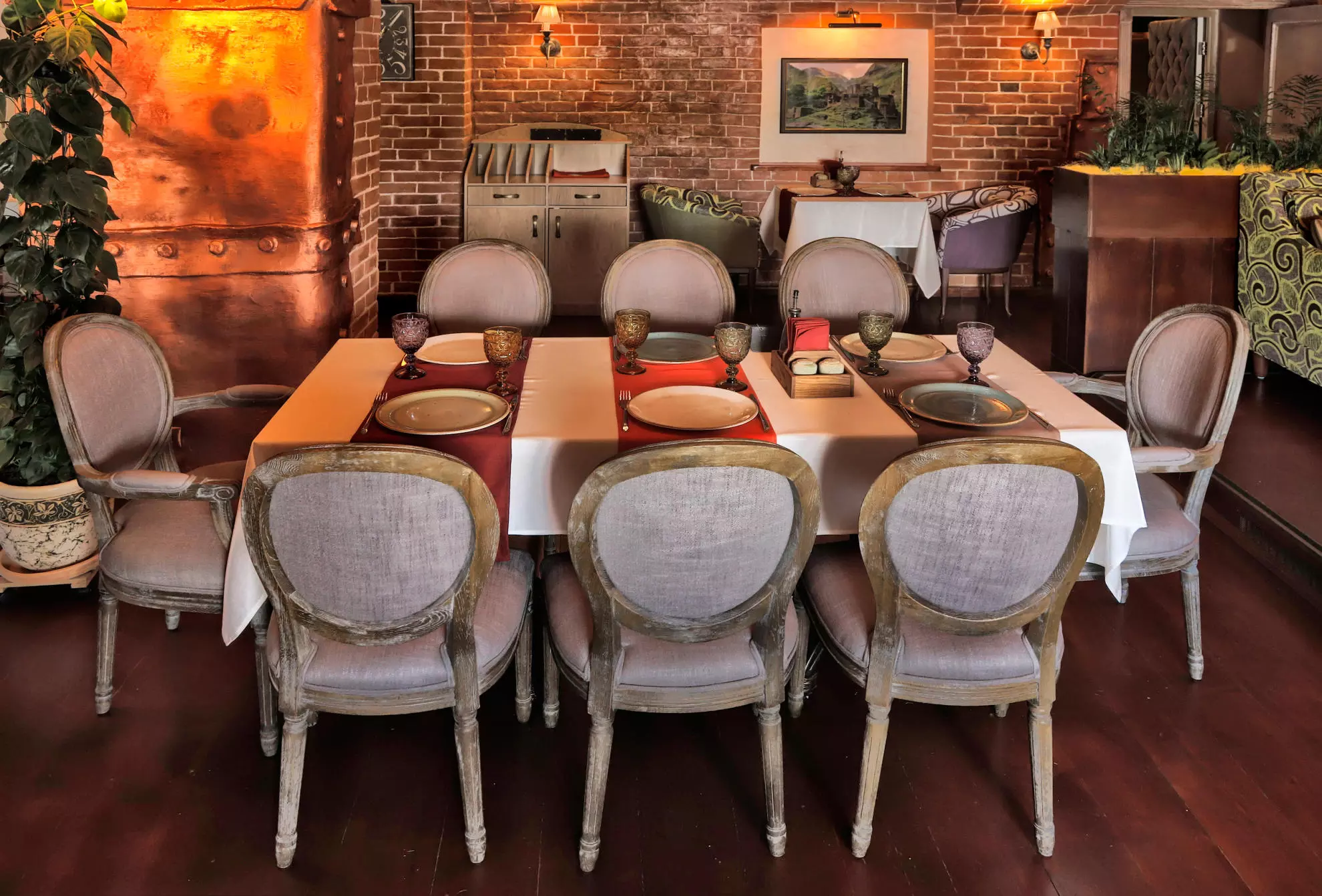 Разместилось заведение в историческом здании, которое было построено еще в конце XVIII века. Дизайнером выступил Малхаз Имерлишвили. Внутреннее убранство сделано в стиле лофт – обилие кирпичной кладки на стенах и потолке, приглушенный свет, вносящий в интерьер нотки романтики, обилие зелени. Получилось просторно и уютно. Гостей ждут мягкие стульчики и диванчики. Встречаются картины, элементы лепнины. С одной стороны, получился популярный по-европейски лофт, а с другой – заведение, встречающее гостей с грузинским гостеприимством.