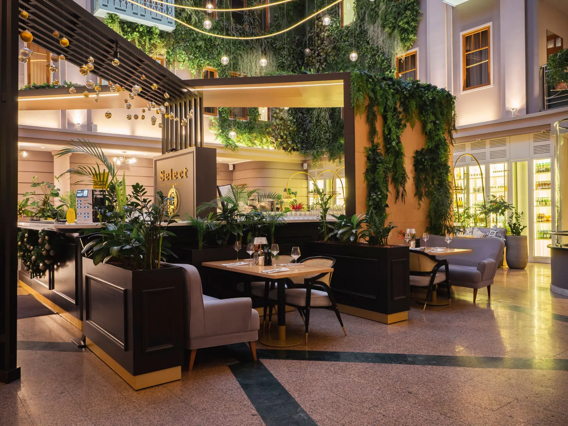 Тем, кто предпочитает легкий элегантный дизайн, обязательно понравится непринужденная обстановка ресторана «Селект». Этому способствуют уютные диванчики и стулья, живые растения и приятное глазу освещение. За счет хорошей вместимости ресторан позволяет проводить широкие свадьбы, торжественные банкеты, фуршеты, корпоративные вечеринки. Для желающих уединиться предлагаются места в VIP-зоне. Также комфортно провести время в кругу семьи или друзей можно на открытом воздухе в летнем кафе.