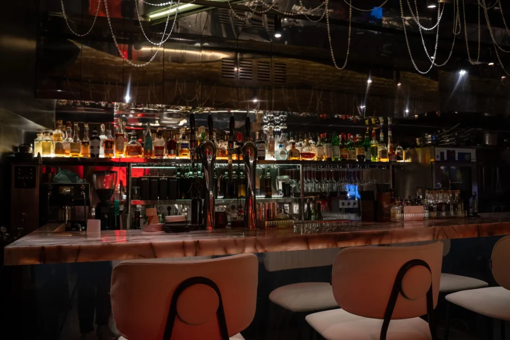 Интерьер у Petite Decadence работает на ту же идею. Он не выглядит случайным фоном для бара и не пытается быть универсальным. Здесь важны камерность, темп, свет и ощущение близости к сцене. Пространство собрано так, чтобы поддерживать не только ужин или коктейльную посадку, но и вечернюю программу. В нем есть главный зал, барная часть, lounge-зона, столы для более уединенной посадки и отдельные сценарии размещения гостей. Это говорит о том, что интерьер изначально продуман не как единый прямолинейный зал, а как пространство с разными режимами пребывания.