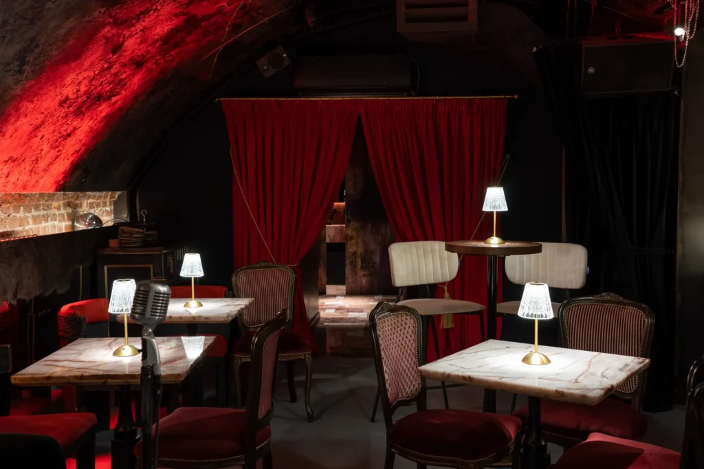 Общий стиль интерьера тяготеет к театральной эстетике. Он не перегружен описательно, но воспринимается как намеренно атмосферный. Здесь важен не эффект демонстративной роскоши, а именно характер места: немного клубный, немного сценический, с отсылкой к французской кабаретной традиции. Такой интерьер не существует отдельно от музыки и вечерней программы. Он работает как часть общей композиции, в которой бар, свет, сцена и публика должны складываться в единое впечатление.