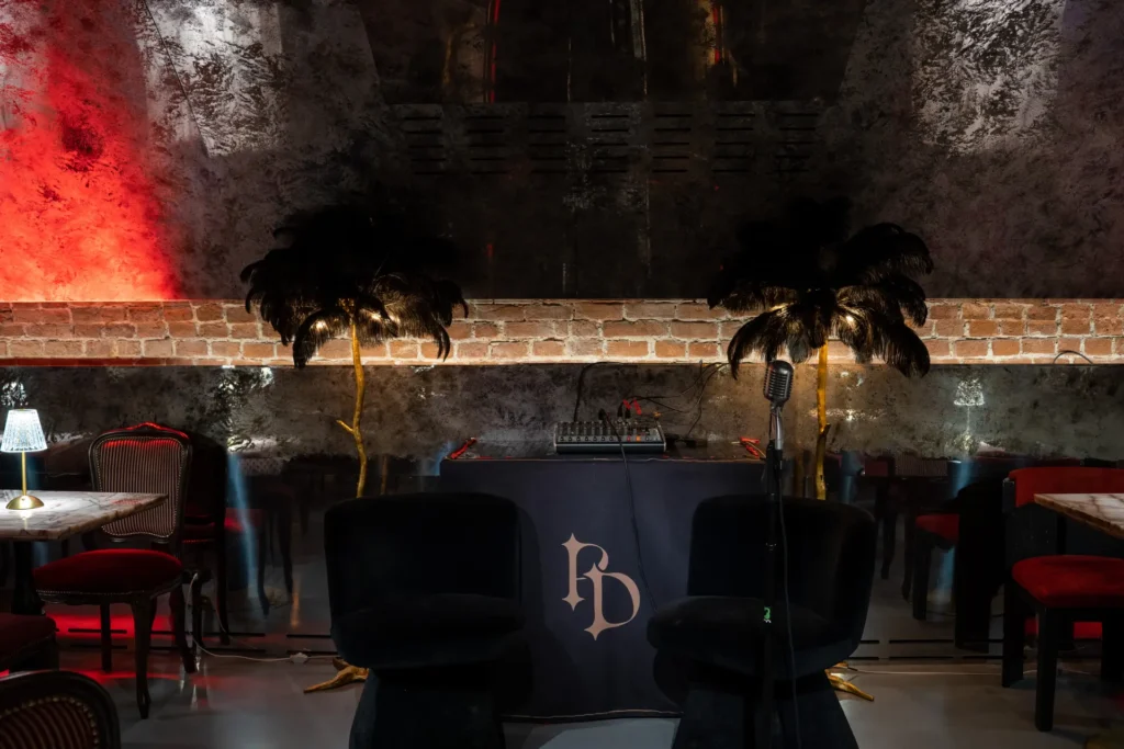 Важная особенность Petite Decadence — камерность. Пространство воспринимается не как большой шумный зал, а как более закрытая, собранная среда. В визуальной подаче заведения считывается идея «подвального» кабаре: полумрак, сцена, музыка, барная стойка, мягкие посадочные зоны. За счет этого место производит впечатление не проходного, а скорее событийного. Сюда идут не просто поужинать, а провести вечер в определенной атмосфере.