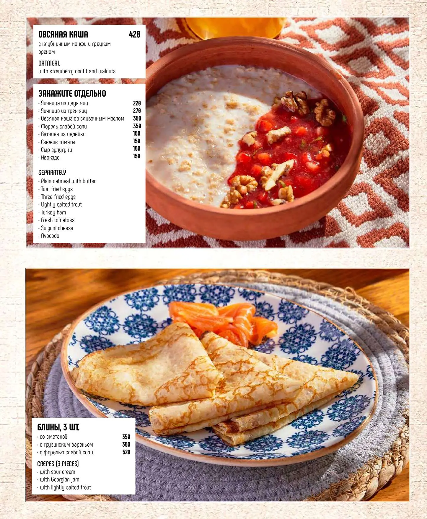 Большой завтрак с форельюФорель слабой соли, авокадо, бриошь, микс салата, крем-чиз, яйцо 5-минутка850 руб.