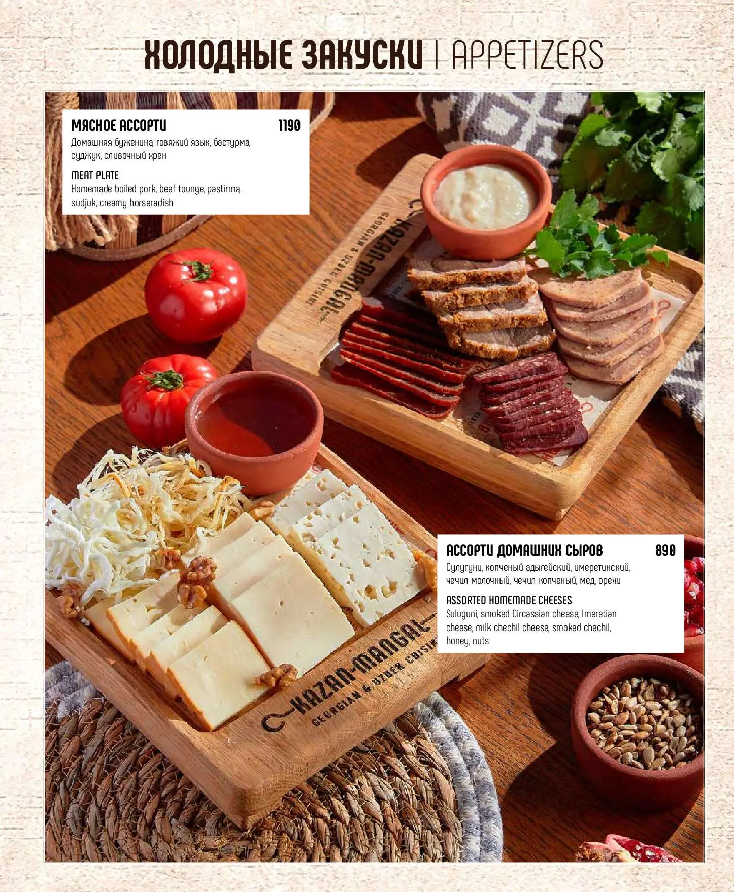 Мясное ассортиДомашняя буженина, говяжий язык, бастурма, суджук, сливочный хрен1190 руб.