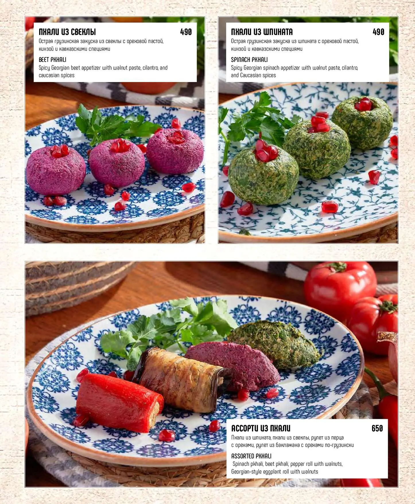 Ассорти из пхалиПхали из шпината, пхали из свеклы, рулет из перца с орехами, рулет из баклажана с орехами по-грузински650 руб.