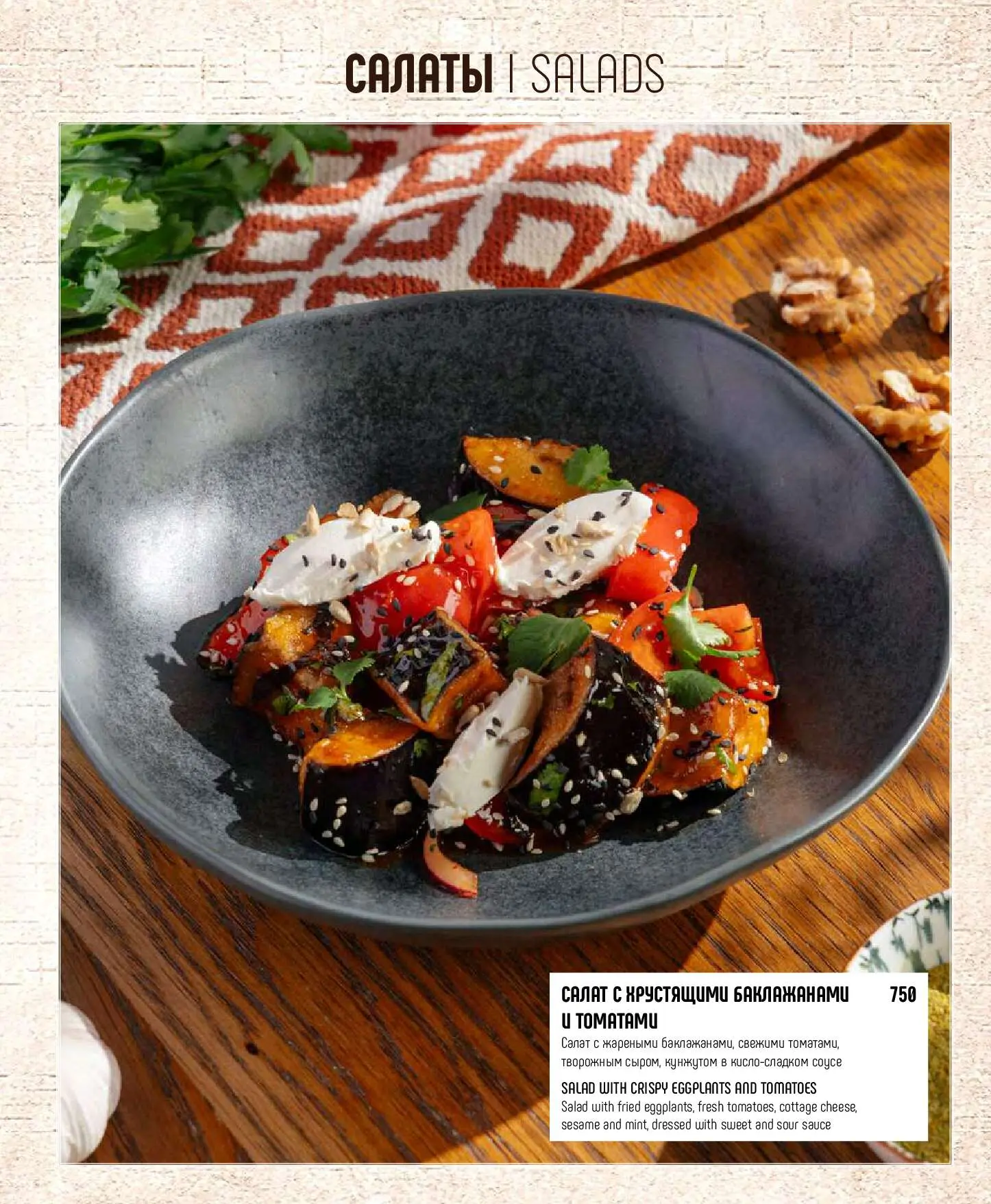 Салат с хрустящими баклажанами и томатамиСалат с жареными баклажанами, свежими томатами, творожным сыром, кунжутом в кисло-сладком соусе750 руб.